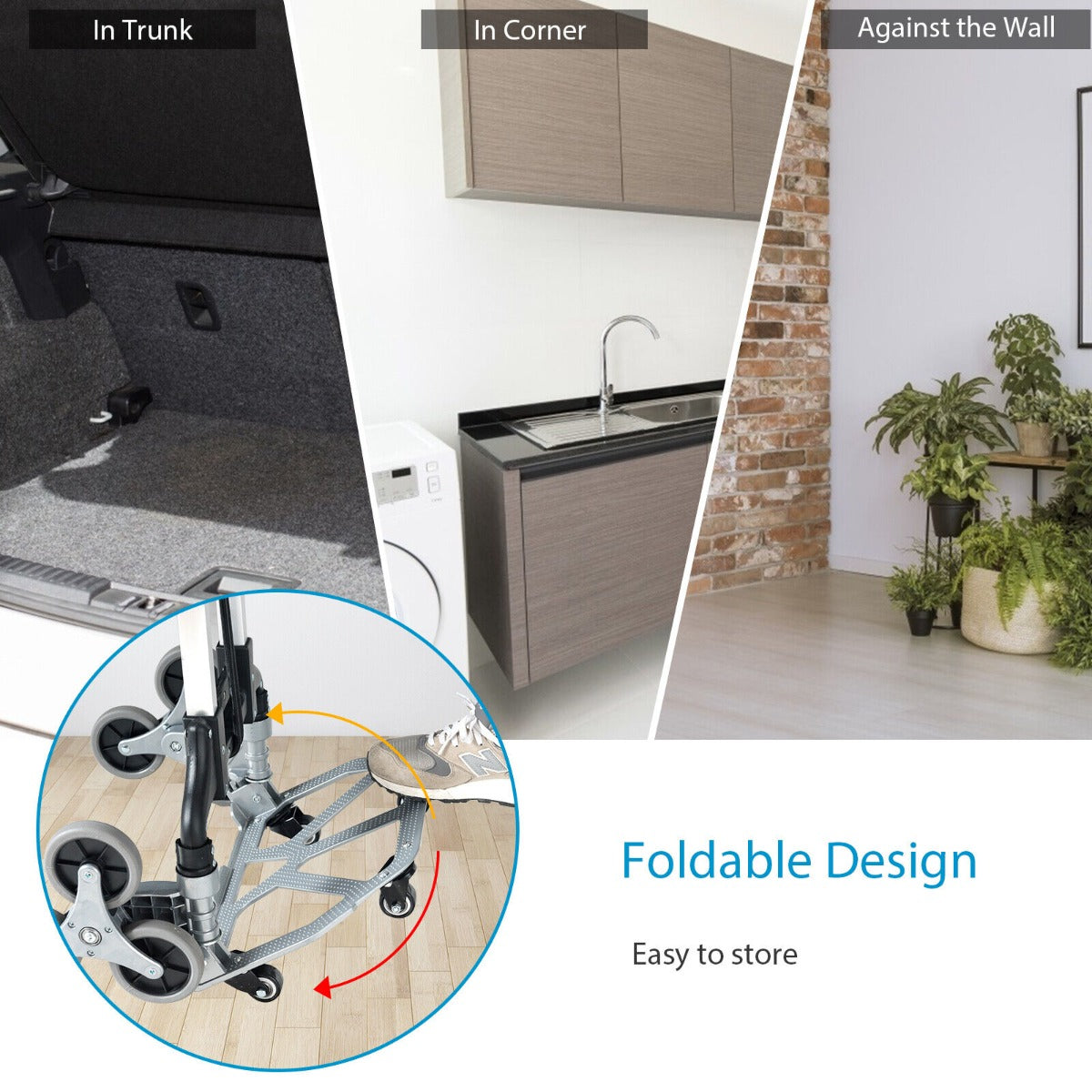 The three-wheel design saves the effort you should have done while 4 extra universal help you move the hand truck effortlessly. Considering that it is necessary to leave a small gap between hands and goods, the adjustable telescoping handle adopts an ergonomic design to avoid potential hurt if the cargo is of substantial size. The elastic rope with a hook helps you fasten the cargo tightly to keep its safety. Also, you don’t need to worry about occupying many places as the hand truck can be folded down flat easily. Crafted from solid aluminium alloy, the luggage cart is sure to show exceptional sturdiness and superior durability. If you are looking for a hand truck like this, do not hesitate to place an order! Flexible Wheels for Labor-Saving Carrying: Equipped with 6 climbing wheels, the hand truck frees you from trouble caused by stair climbing when you have to bring some heavy items home. There are 4 universal wheels on the bottom, which makes it easier for you to push the cart on the ground, so as to save more effort. 3 Level Adjustable Humanized Handle: The stair climbing cart features 3-position adjustable telescoping handle, allowing you to adjust the handle height based on your own needs. Besides, the handle adopts humanized design to protect your hand from hurt. Comparable with other trolleys, the handle of the dolly trolley is more stable and flexible. Solid Platform and Elastic Rope: The platform is sized to hold everyday luggage and shopping bags. Included elastic rope can fasten goods tightly to ensure enhanced safety while avoiding turning over. Solid aluminium alloy material endows the hand trolley on wheels with higher load capacity, enabling you to make the best use of it. Foldable Design: Not only is the stair climber cart foldable, but it is compact when folded down flat and saves your storage place in the trunk, home or storehouse. In addition, the sack truck weighs only 4 kg, lightweight enough for convenient transportation without a much-tired feeling. Sturdy Structure and Multi Usage: Constructed from thickened aluminium alloy, the personal dolly’s great performance can be seen in its superior sturdiness and durability. It can be used as a stair climbing cart to save effort when moving up and down stairs or served as a cargo cart for industrial applications.