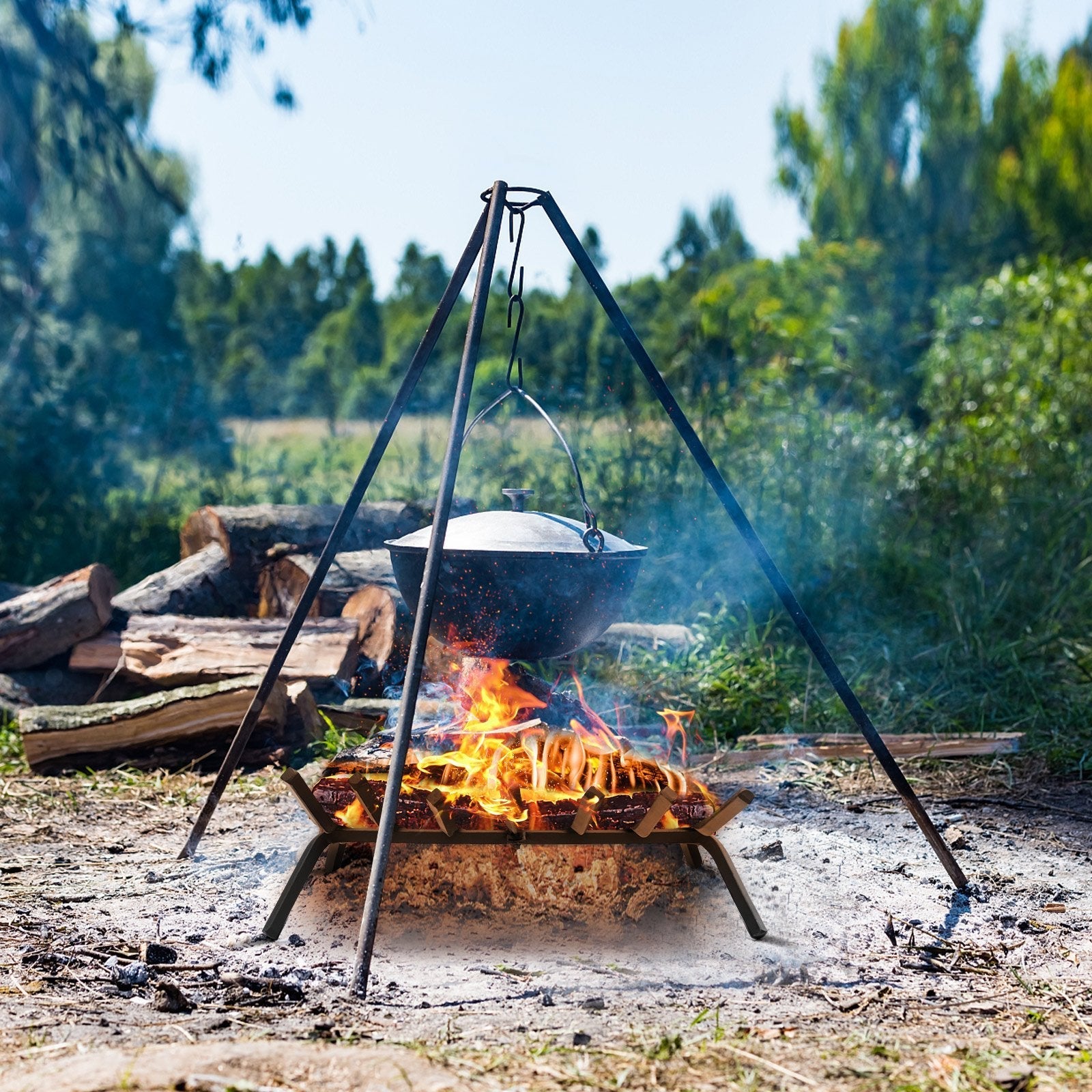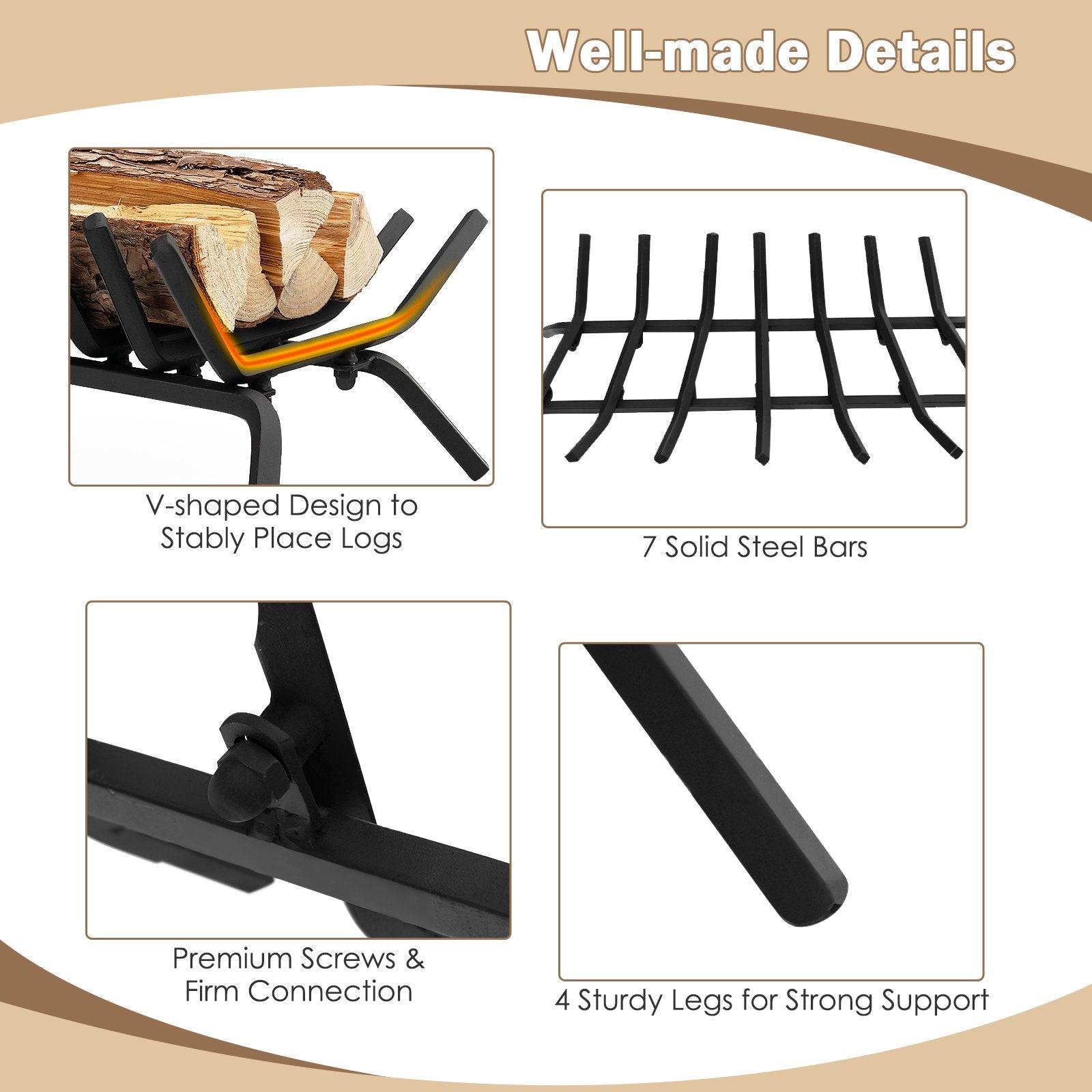The log grate is made of high-quality solid all-steel. 7 steel bars are used as the main structure with sturdy legs supporting the entire grate, which are firm and stable. The enhanced V-shape surfaces of wide bars wood burning fireplace make it easier to hold wood and burn coal securely, preventing the firewood from rolling down. The log holder is raised from the ground, which is conducive to the circulation of air and makes the firewood burn more vigorously. This fireplace log grate is ideal for both indoor decorative wood burning fire places and outdoor fire pit grate. Bring this fireplace log grate to your indoor fireplace, outdoor fire pits, backyards patios wood burning stoves, etc. Solid Steel Construction: The log grate is made of 7 steel bars with a hard thickness. Two supporting bars not only keep firewood from falling and provide support, but reduce its deformation that caused by long-term combustion. All steel structure makes this fireplace grate more durable and stronger for long lasting performance. High Temperature Stove Paint: This fireplace log holder is designed with a heavy-duty steel structure and has a black powder coat surface for high durability. More importantly, the black paint on this log grate is high temperature resistant, even long-term high temperature barbecue will not change color. Superior Airflow, Lasting Heat: The outdoor fire pit grate keeps the wood 11 cm off the ground, allowing better air circulation around the logs and using less wood for powerful firepower. Longer lasting fire for better warming while minimizing smoke. You can light your fireplace easily at bottom of wood, no more burning your hands or using fire starters. Stabilize More Logs: Long bars give this wood burning fireplace tool enough surface area to hold more wood securely and contain coals. Besides, the V-shape fire wood rack helps prevent the logs from rolling out of the firewood grate, thereby making the fire hotter, better, safer, and reducing fiddling to maintain the fire. Wide Range of Application: We provide detailed instruction and hardware for your simple assembly. This sturdy, durable log fire grate is suitable for both indoor decorative wood-burning fireplaces and outdoor activities. With its simple compact design, it is convenient to take it to the backyard, patio, deck, mantelpiece, or anywhere.