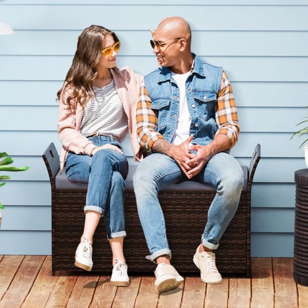 The dual-purpose bench not only offers a stylish seating option for your deck or garden, but also delivers generous storage space for your outdoor necessities, keeping your living area tidy and organized. Crafted from hard-wearing PE wicker, it is built to withstand prolonged use. Its practical design blends safety with convenience, featuring easy-carry handles for effortless portability, along with 2 gas rods to keep the lid in place. Plus, its machine washable cushion cover demands minimal upkeep. Look no further than our outdoor bench, your go-to choice for outdoor living! 2-in-1 Design: With its 112 cm wide top,our outdoor benchwith storage comfortably seats up to 2 people. The area beneath the seat offers a hidden storage space, ideal for stowing away cushions, gardening tools, pool supplies, and more. Hand-woven PE Wicker: Crafted from hand-woven PE wicker, the patio bench seamlessly combines the natural beautyof rattan with durability. Fade-resistantand sun-protective, it will not crack or peel over time. Note: please avoid direct rain exposure. Comfortable Seating: Sink into the comfy support of the included 8 cm thickcushion. Soft-paddedwith high density sponge, it offers a cozy seating for your outdoor relaxations. Plus, its polyester fabric coveris removable and machine washable, simplifying maintenance. Functional Design:Equipped with 2 robustpneumatic rods, the lid of the outdoor storage bench remains securely open without pinching your hands. For added portability, the bench features cut-out handles, allowing you to easily relocate it wherever you fancy. Widely Applicable: Designed for versatility, the outdoor storage bench with a cushion seamlessly blends into any outdoor setting, whether it is your yard, porch, deck, or poolside. Product dimensions: 125 x 56 x 71 cm (L x W x H).