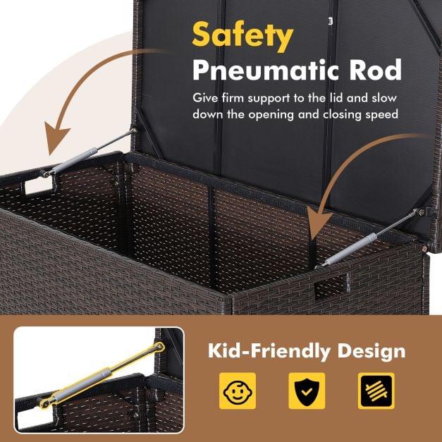 -50-gal storage space satisfies your multiple storage demands-Waterproof and removable PU coated liner with zipper protects the items well-Solid and rustproof steel frame for high stability-High-grade rattan adds elegance and ensures long-time outdoor use-Safety pneumatic rods offer strong support and avoid potential dangers-Easy to move the box with 2 universal wheels and side handles-Can be used as a patio side table-Suitable for backyard, poolside and so on-Easy to assemble with the clear instruction