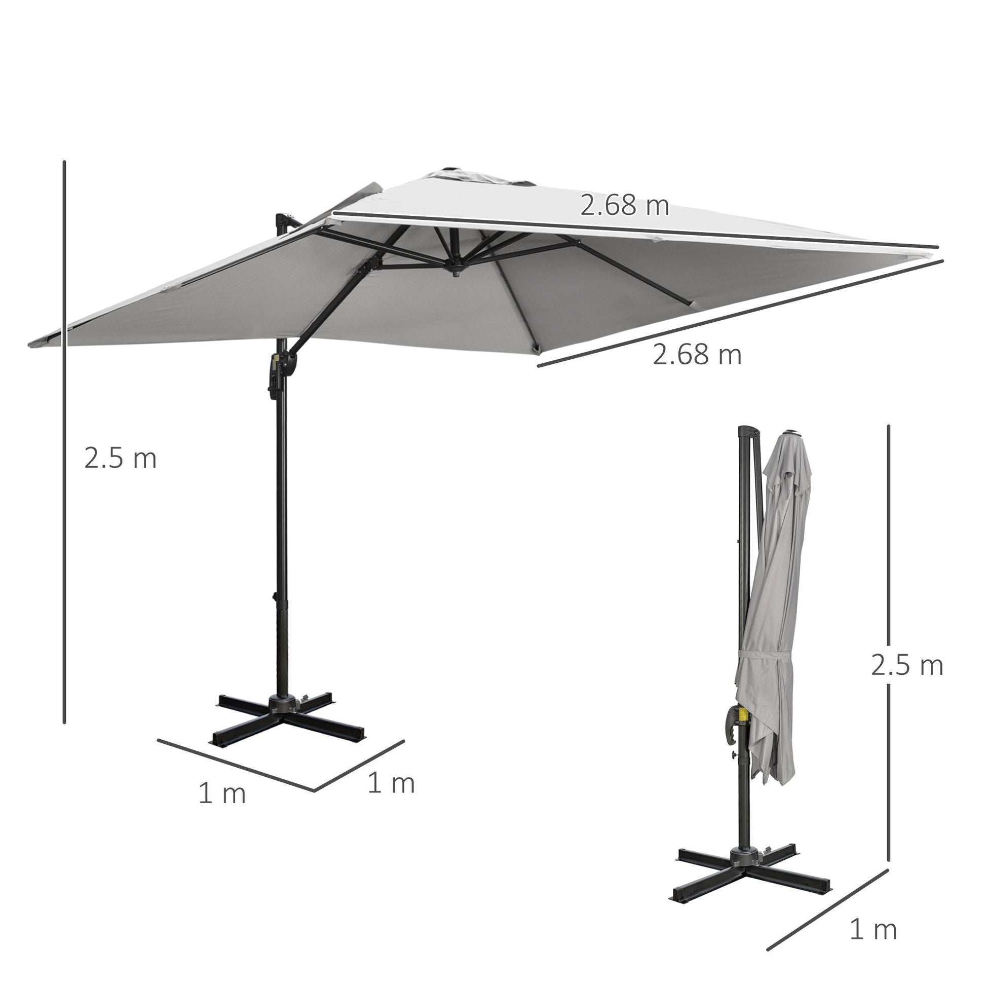 Outsunny 2.7 x 2.7 m Cantilever Parasol, Square Overhanging Umbrella with Cross Base, Crank Handle, Tilt, 360 Rotation and Aluminium Frame, Grey
