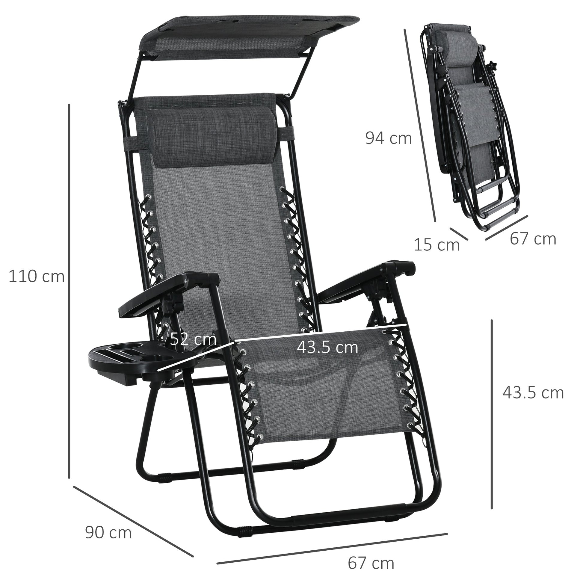 Outsunny 2 Piece Foldable Reclining Garden Chair with Headrest, Zero Gravity Deck Sun Lounger Seat Chair with Footrest, Armrest, Cup Holder & Canopy Shade, Light Grey