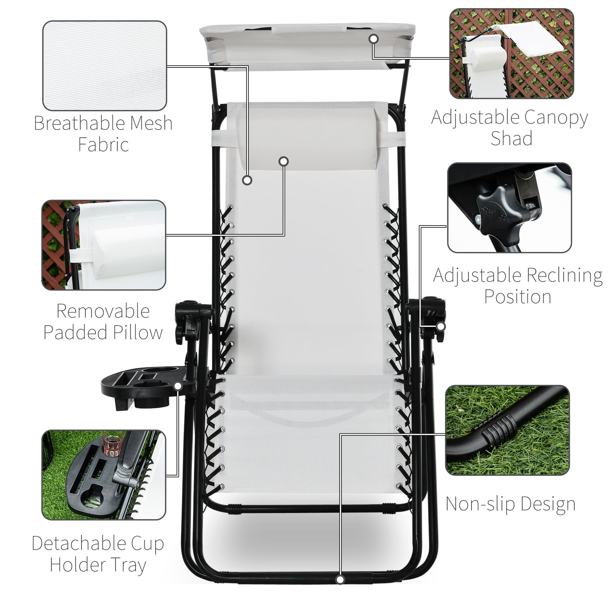Outsunny 2 Piece Foldable Reclining Garden Chair with Headrest, Zero Gravity Deck Sun Lounger Seat Chair with Footrest, Armrest, Cup Holder & Canopy Shade, White