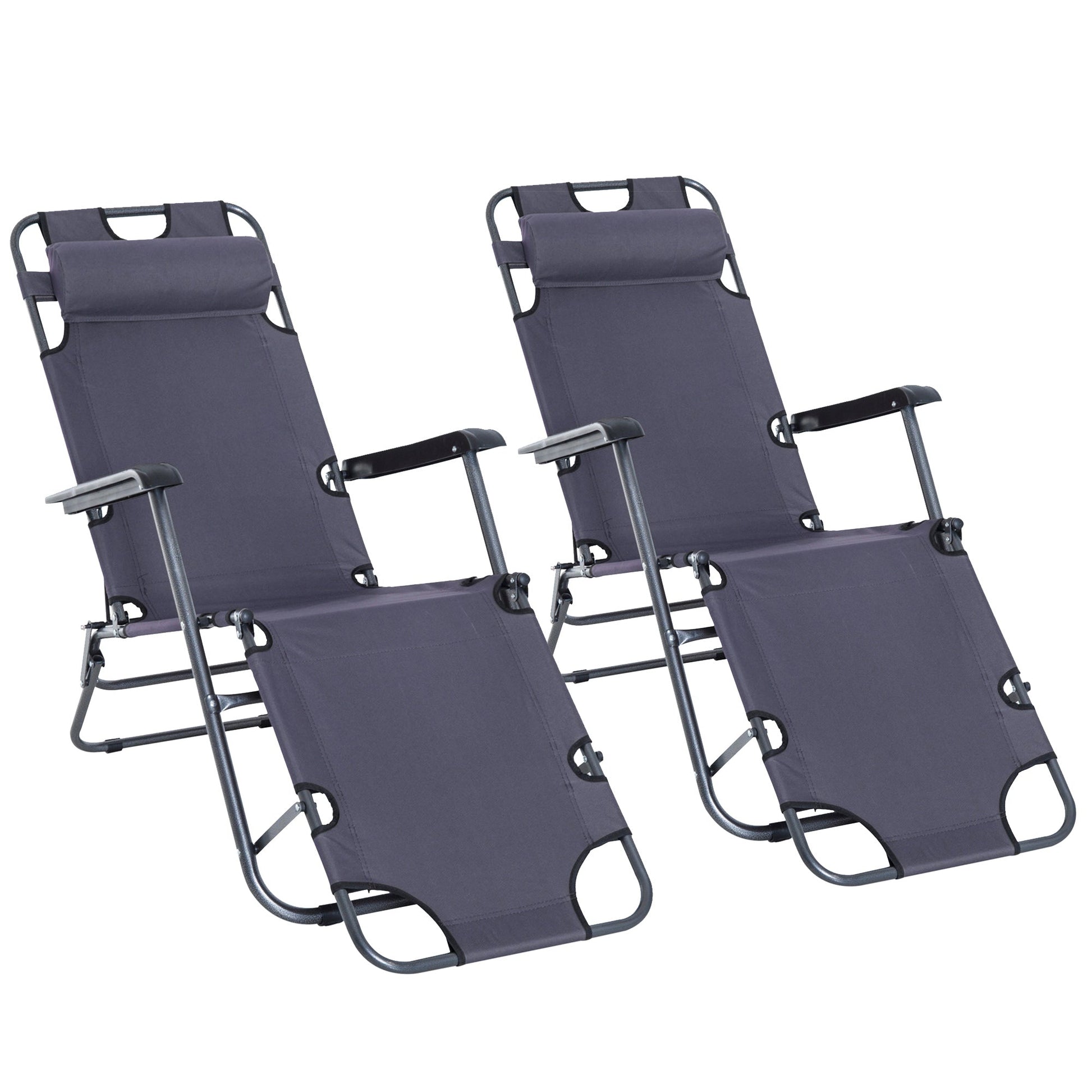 Outsunny 2 in 1 Folding Sun Lounger Reclining Garden Chair Set of 2 with 2-Level Adjustable Backrest, Outdoor Zero Gravity Recliner Garden Chairs with Head Pillow and Armrests, Grey