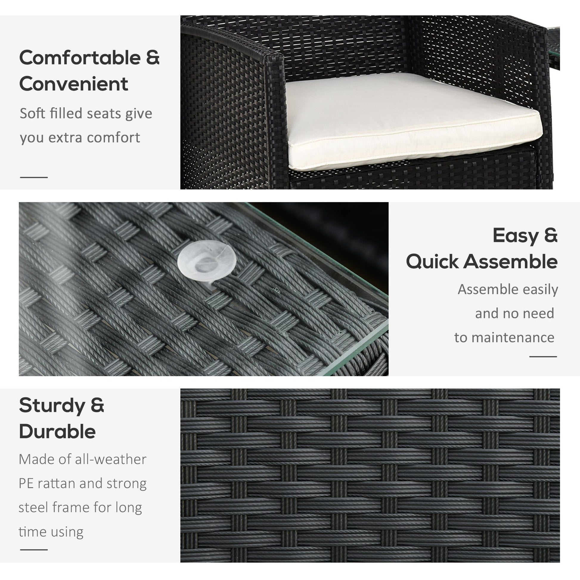 Outsunny 2-Seater PE Rattan Side Table & Armchair Bistro Set Jack and Jill Seat w/ Pillows Black
