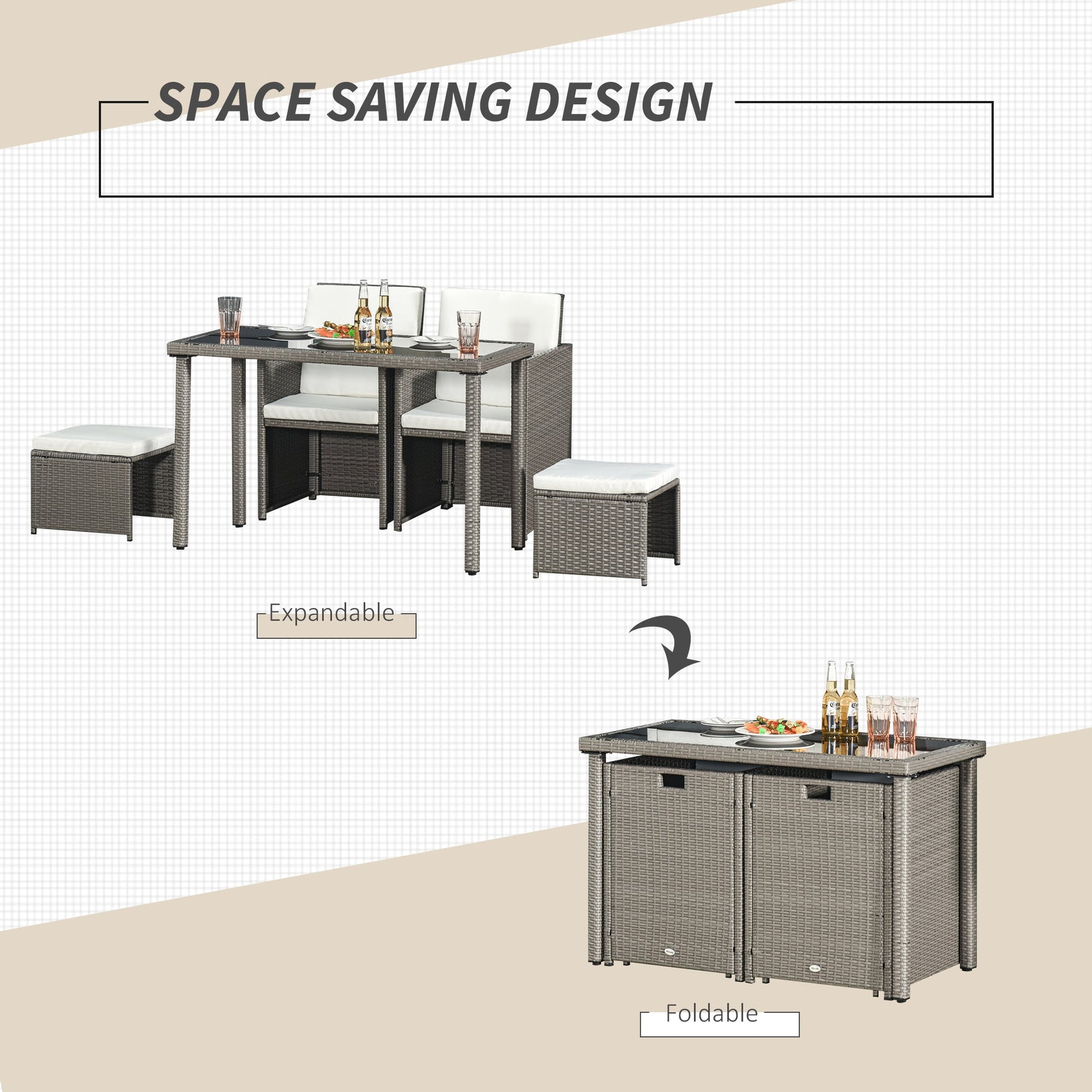 Outsunny 2 Seater Rattan Cube Garden Furniture Set, Rattan Dining Set with Cushions, Outdoor Dining Table and Chairs with 2 Armchairs, 2 Stools, Rectangular Glass Top Table for Patio, Balcony, Grey