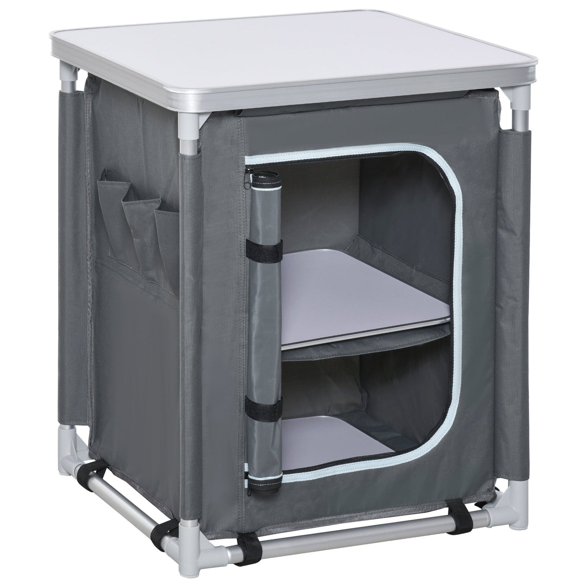 Ready when you are, this camping kitchen unit from Outsunny is a must for your camping trips, outdoor gatherings and more. Made from aluminium, the camping cooking table is lightweight and tough for reliable repeated use. The fabric coat covering the frame is water-resistant and features a door to shield inside. There are two shelves for convenient storage, with the solid MDF table-top giving you a flat and reliable surface to use. Comes completed with bag for easy carrying.