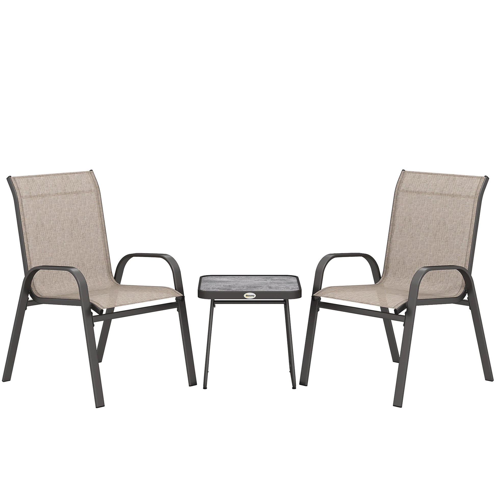 This Outsunny three-piece set is great for relaxing with company outdoors. Comes with two chairs and table. Each piece has a steel frame: strong and supportive. A great addition for all outdoor spaces.