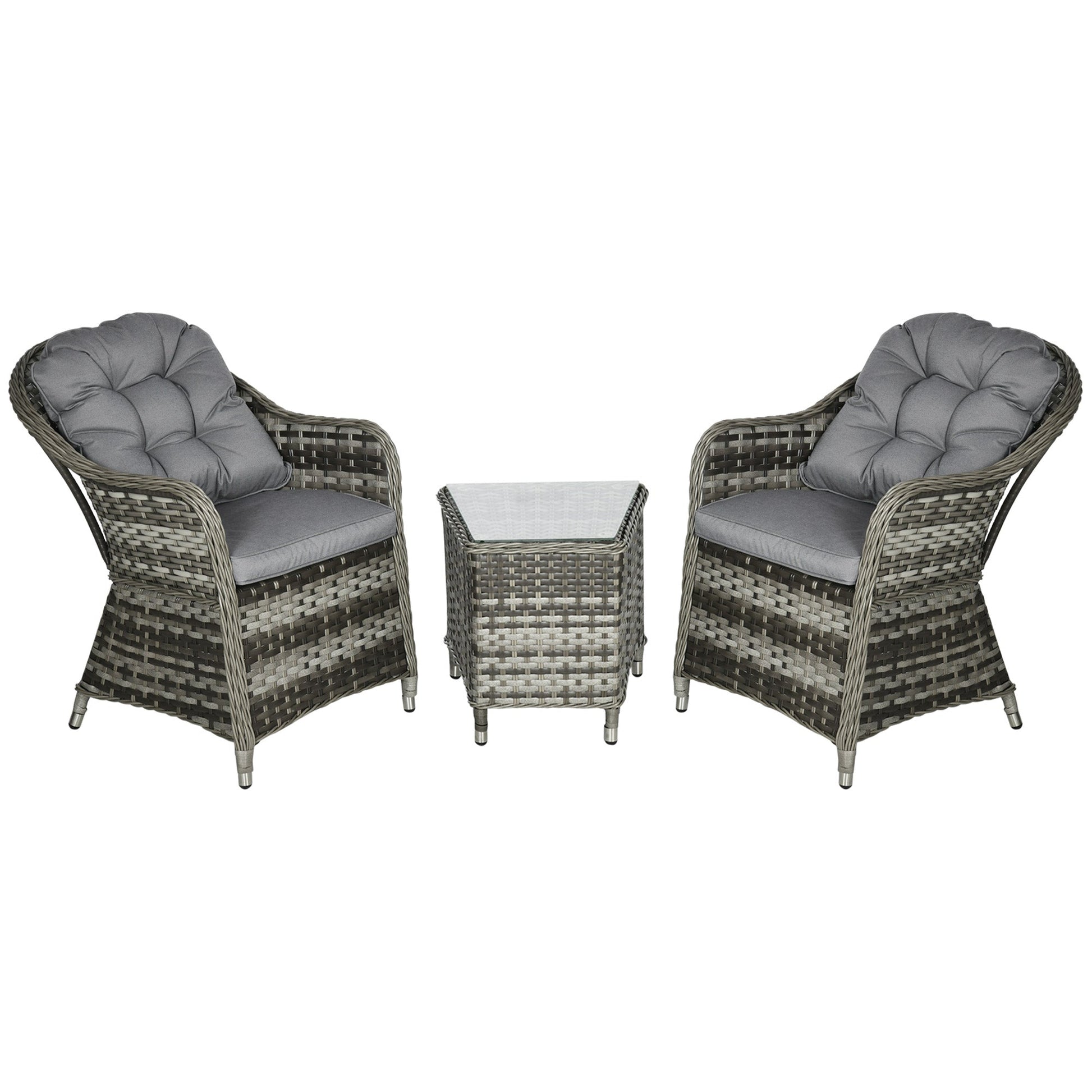 Outsunny 3 Pieces Rattan Bistro Set, Wicker Garden Bistro Set, Glass Top Balcony Table and Chairs with Cushions for Outdoor, Patio, Balcony, Grey