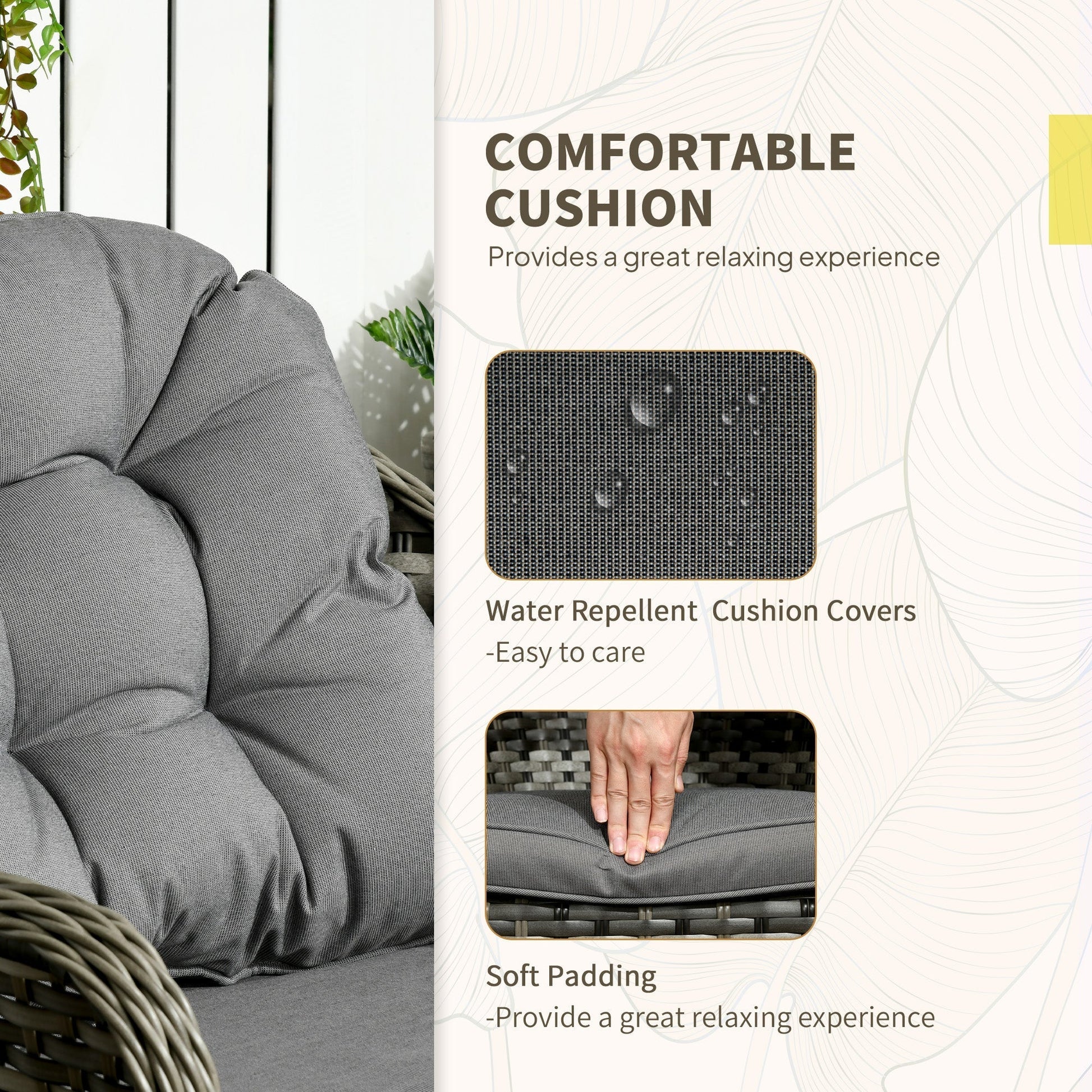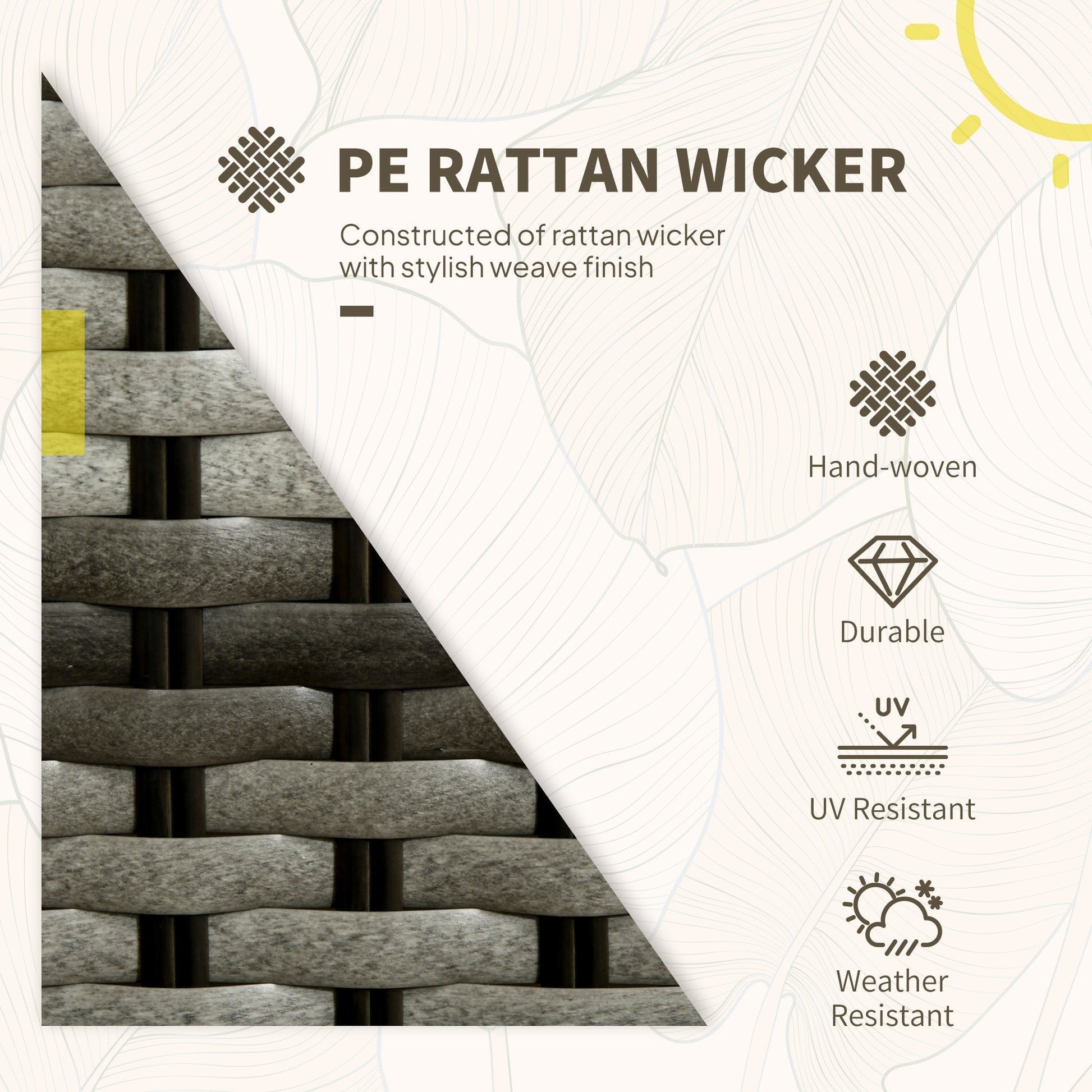 Do those lazy afternoons in the sun the right way – choose this rattan patio furniture set from Outsunny. Formed of three pieces – a garden table and two chairs; enjoy outdoors with company. Powder coated aluminium frame for a strong structure, wrapped in stylish plastic rattan - double the durability. Both chairs come with seat and back cushions for comfort.