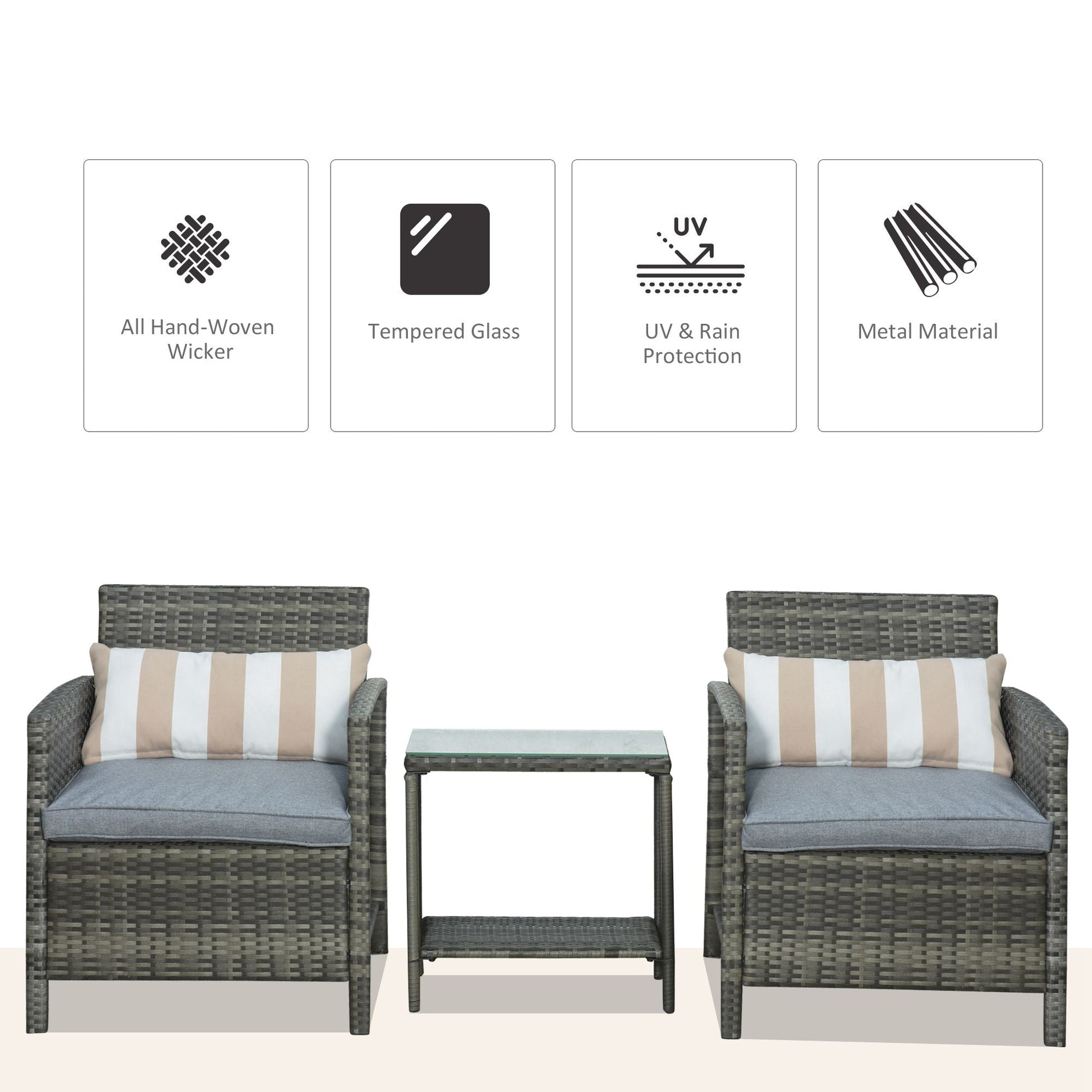 Outsunny 3 Pieces Rattan Bistro Set, Wicker Garden Furniture Set, Glass Top 2-tier Coffee Table and Chairs Set with Pillows and Washable Cushions for Outdoor, Patio, Balcony, Grey