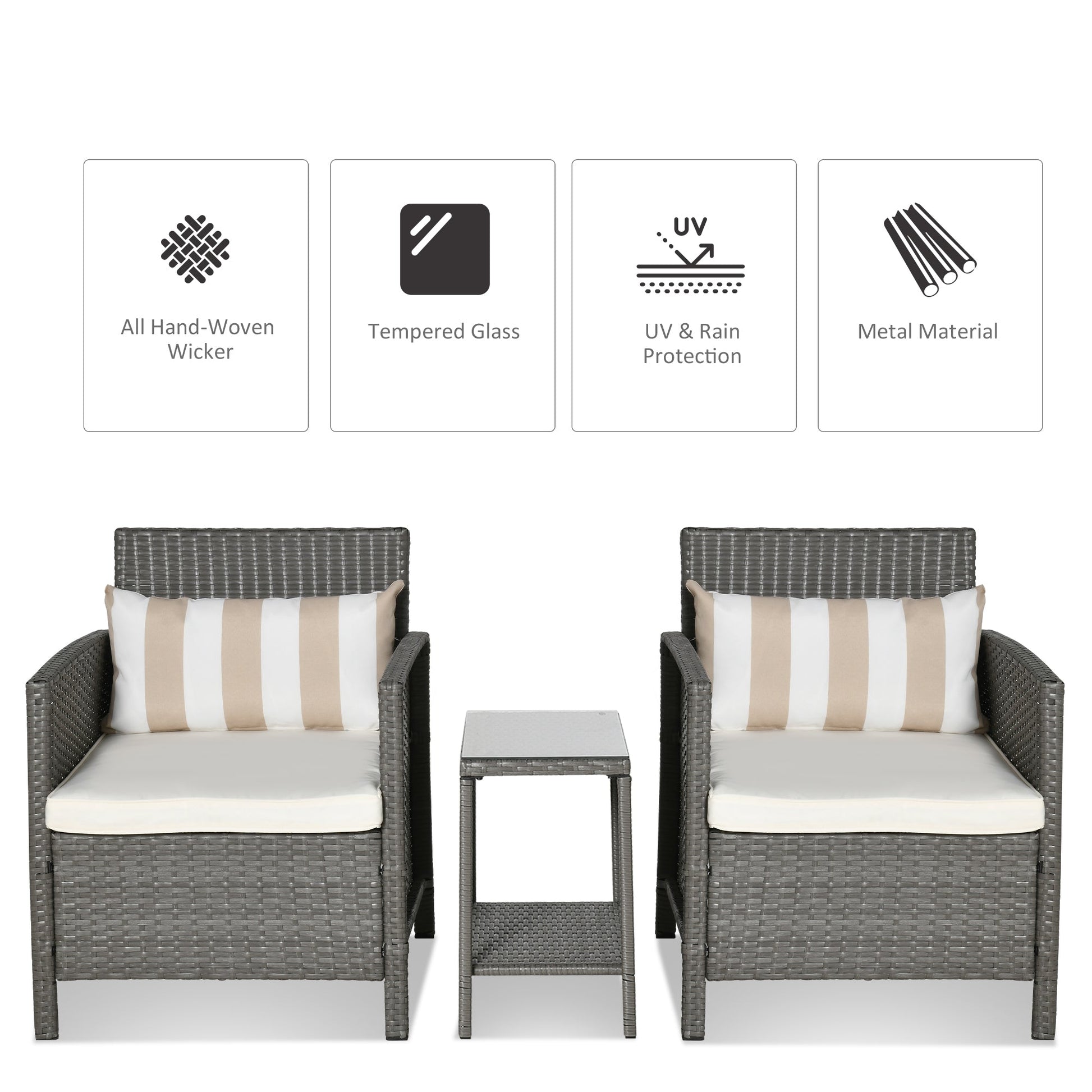 Make the right choice for the upcoming Summer season – choose this three-piece dining set from Outsunny for endless hours of comfort and joy. In a contrasting cream tone, thick cushions are placed on the seats for comfort, with a stylish striped bolster cushion also included for extra style – all with removable covers which can be washed clean to keep them fresh and hygienic. The set is completed with a matching two-tier table, with a tempered glass top for a chic finishing touch.