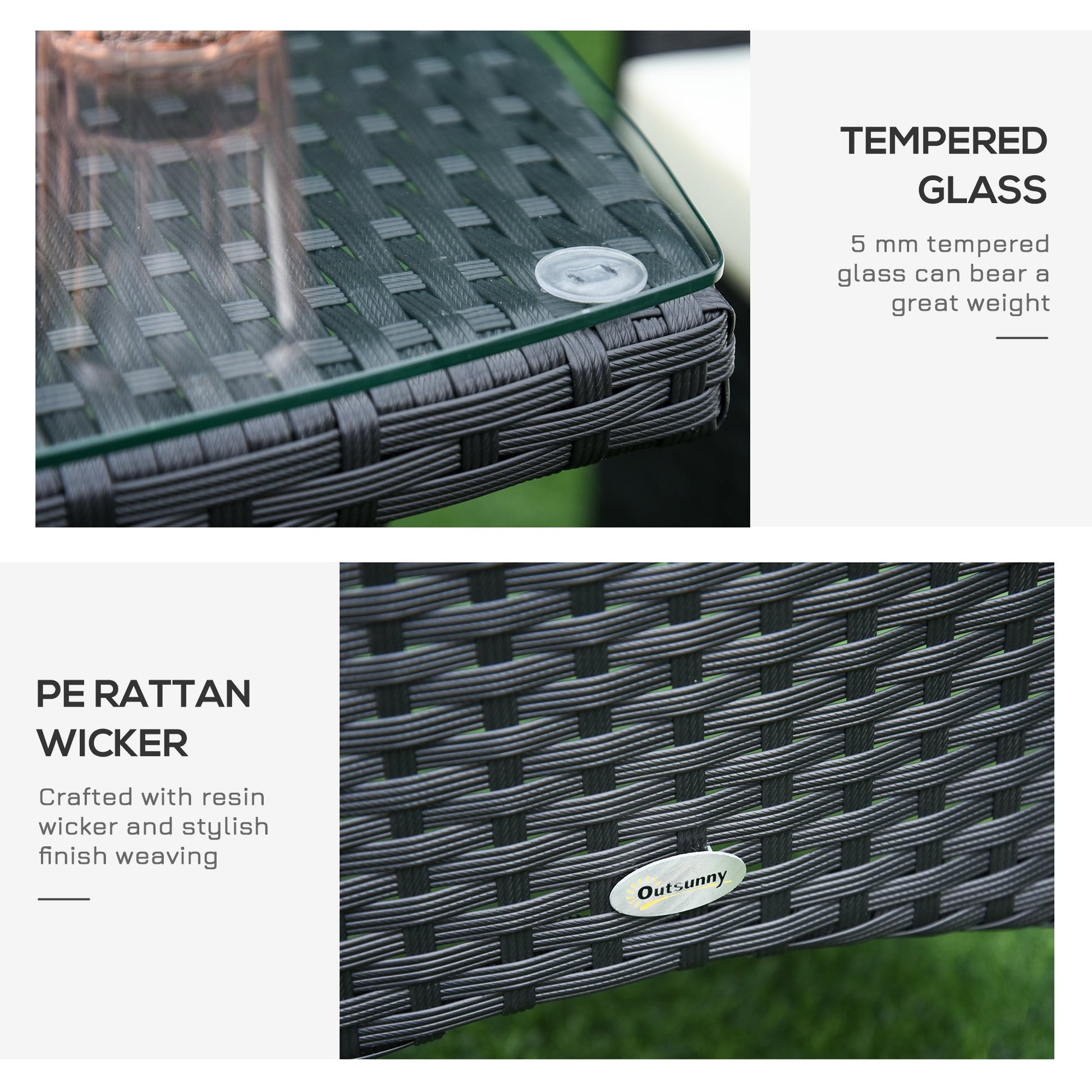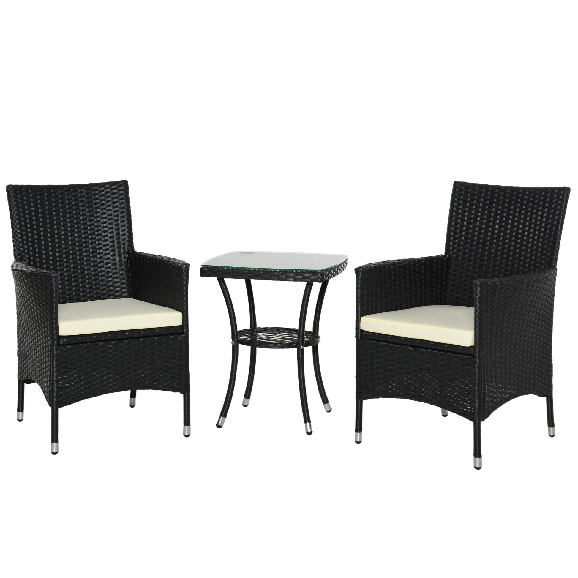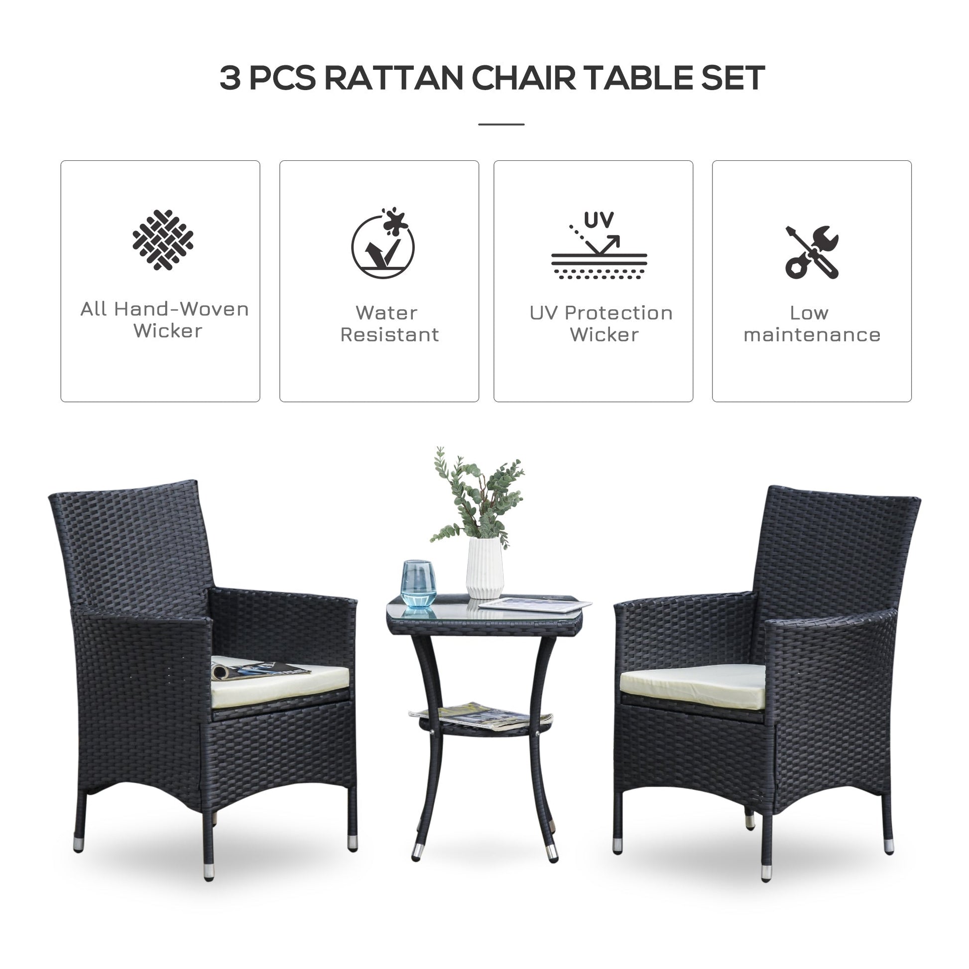 Outsunny 3 Pieces Rattan Bistro Set, Wicker Garden Furniture Set with 2-Tier Coffee Table and Chairs, Cushions, for Outdoor Patio Balcony, Black