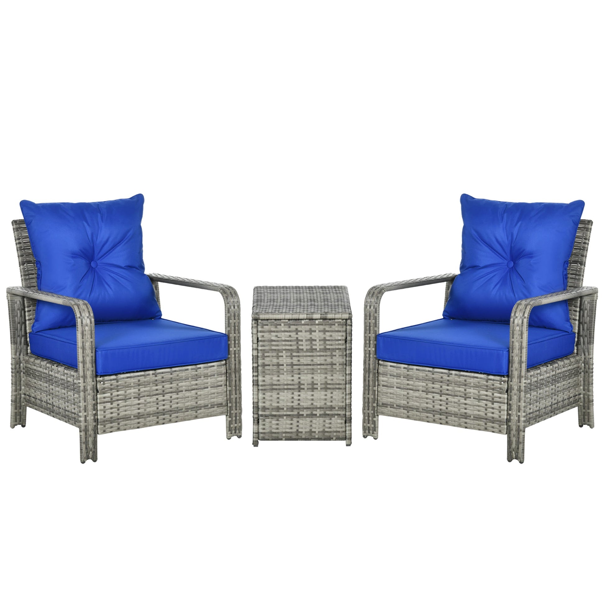 Outsunny 3 Pieces Rattan Bistro Set, Wicker Garden Furniture Set with Storage Coffee Table and Chairs, Thickened Cushions for Outdoor, Patio, Balcony, Blue