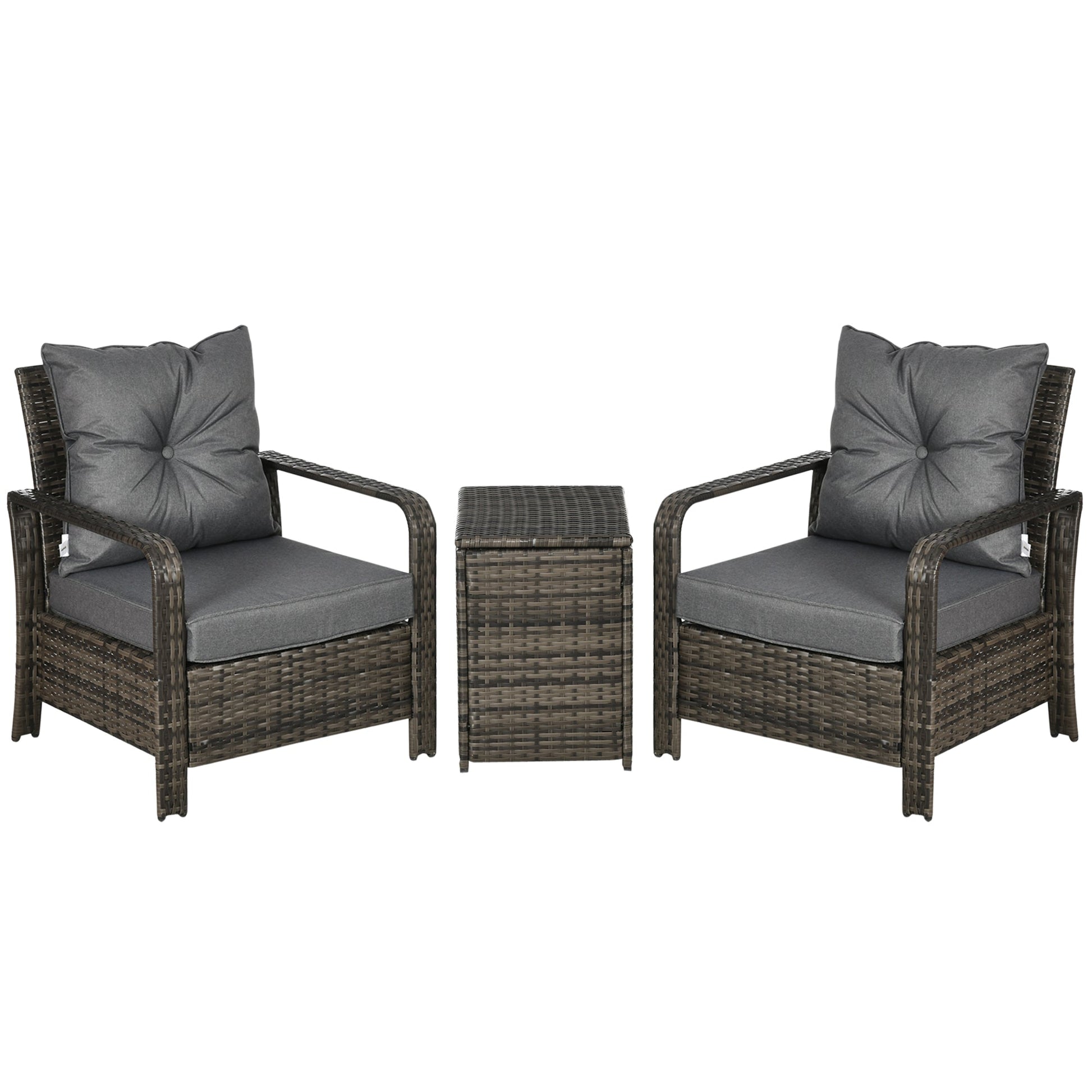 Outsunny 3 Pieces Rattan Bistro Set, Wicker Garden Furniture Set with Storage Coffee Table and Chairs, Thickened Cushions for Outdoor, Patio, Balcony, Grey