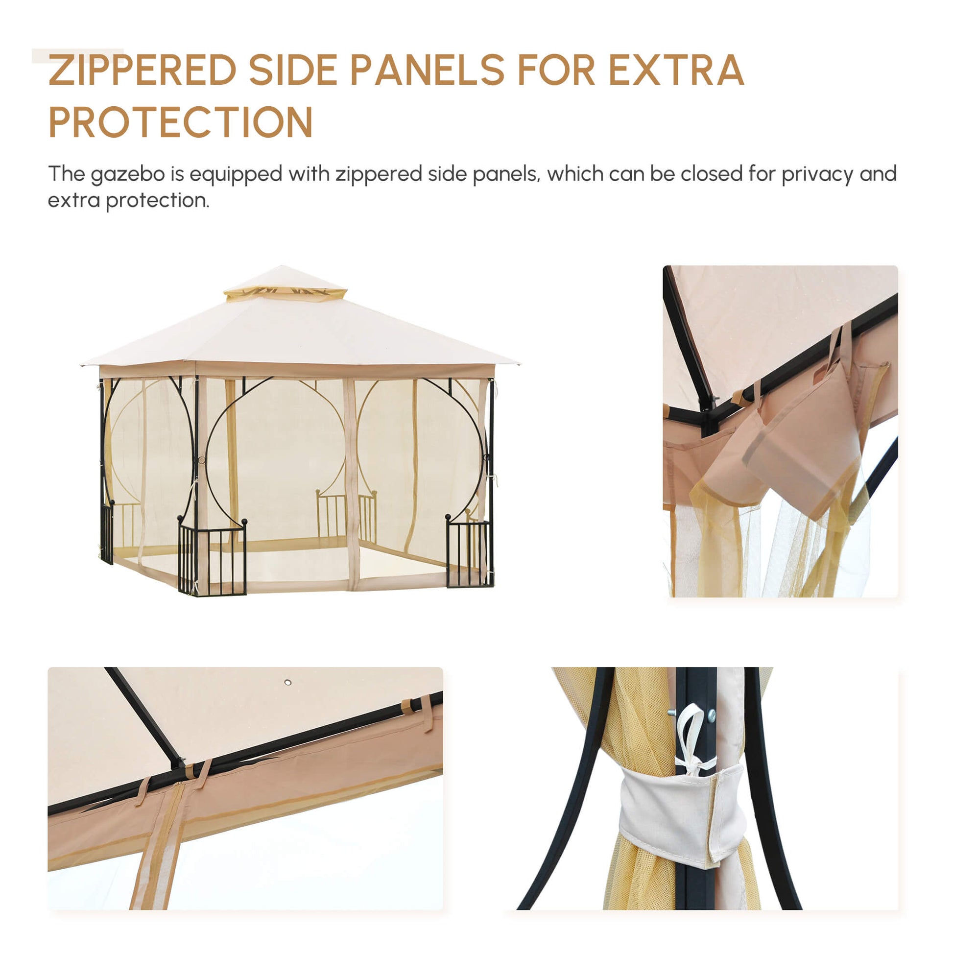 Outsunny 3 x 3(m) Garden Gazebo Patio Party Tent Shelter Outdoor Canopy Double Tier Sun Shade Metal Frame Netting, Beige
