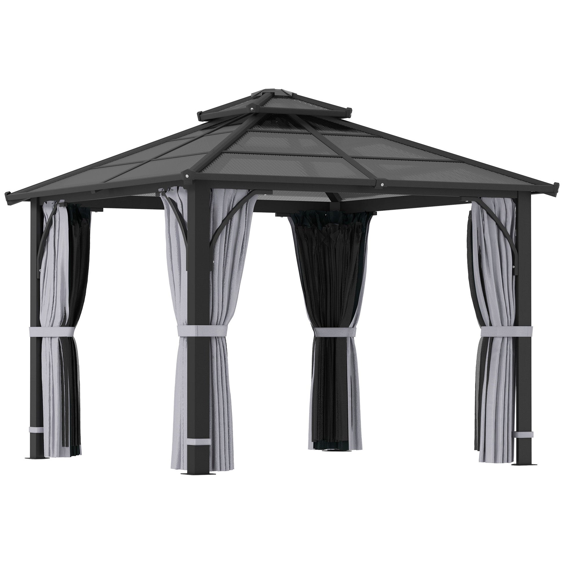 Outsunny 3 x 3(m) Hardtop Gazebo Canopy with 7mm Double Polycarbonate Roof, Garden Gazebo Permanent Pavilion with Mosquito Netting and Curtains for Patio, Deck, Dark Grey