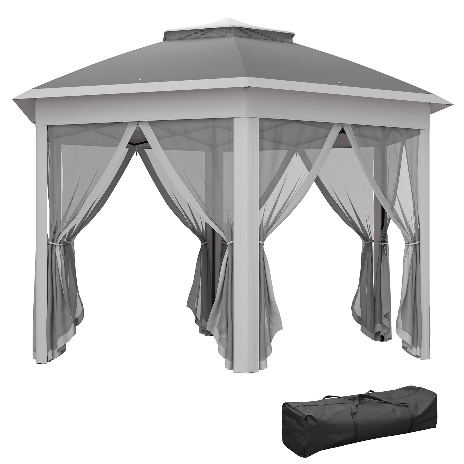Outsunny 3 x 4m Garden Gazebo Hexagon Pop Up Gazebo Party Tent Canopy Double Roof Instant Shelter with Netting and Carry Bag for Outdoor Patio, Dark Grey
