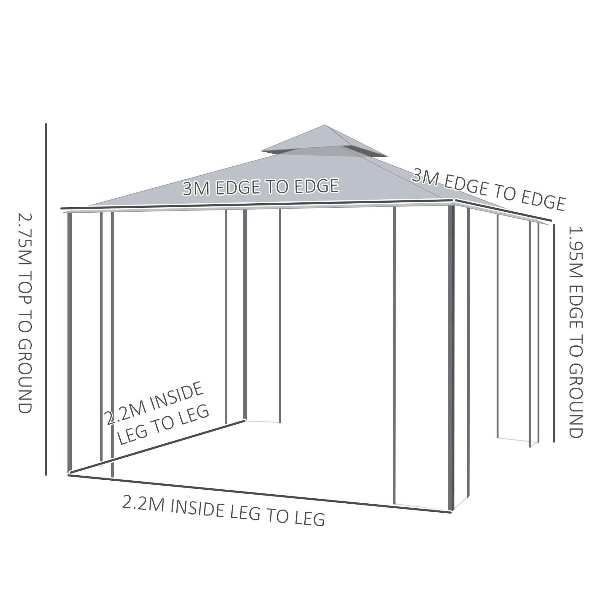 Outsunny 3(M)x3(M) Garden Gazebo Double Top Outdoor Canopy Patio Event Party Wedding Tent Backyard Sun Shade with Netting - Grey