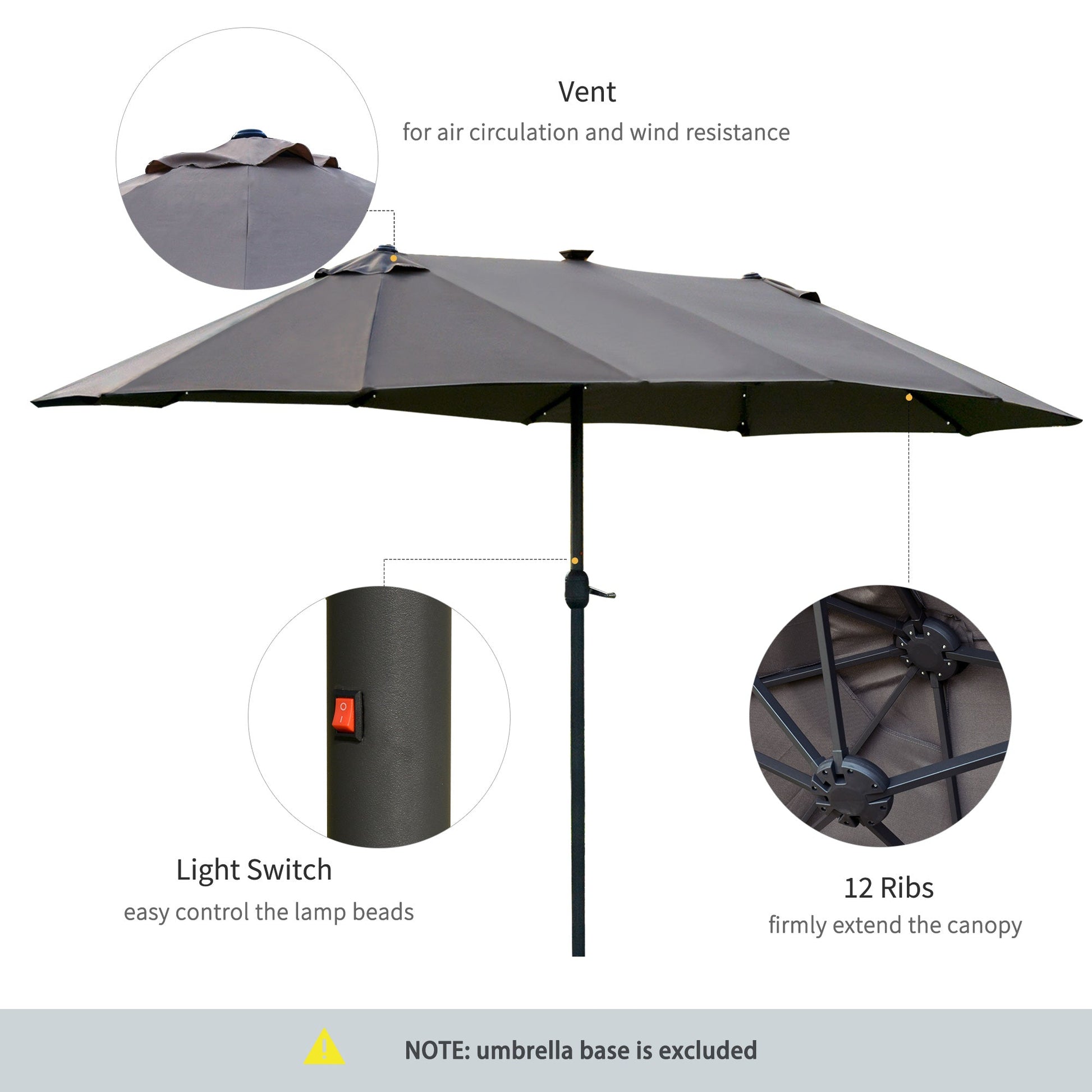 It's time for your garden to shine with this double-sided parasol from Outsunny. A stylish design, the parasol umbrella features 36 lights on the frame ribs to light up your outdoor seating when dark. The large double parasol garden creates plenty of shade, protecting you from direct sunlight. Using a crank mechanism for effortless opening and closing. If you've been searching for a new way to change your garden, then this garden umbrella is the answer. Matching base: Outsunny sku 84D-089.\n