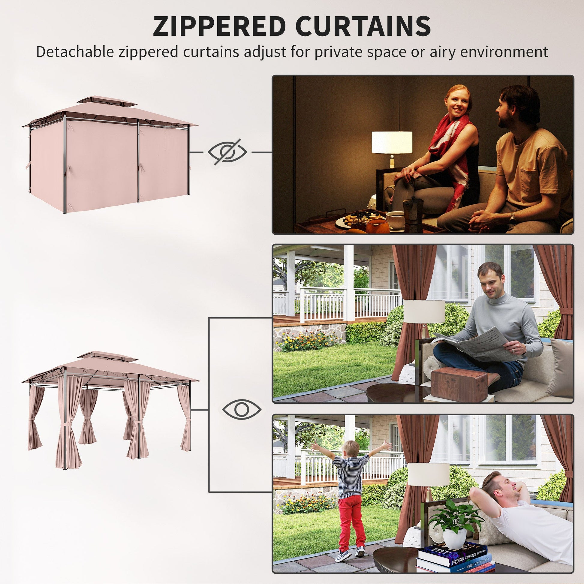 Outsunny 4m x 3(m)Garden Gazebo, Double Roof Outdoor Gazebo Canopy Shelter with Curtains, Solid Steel Frame for Patio, Garden, Brown