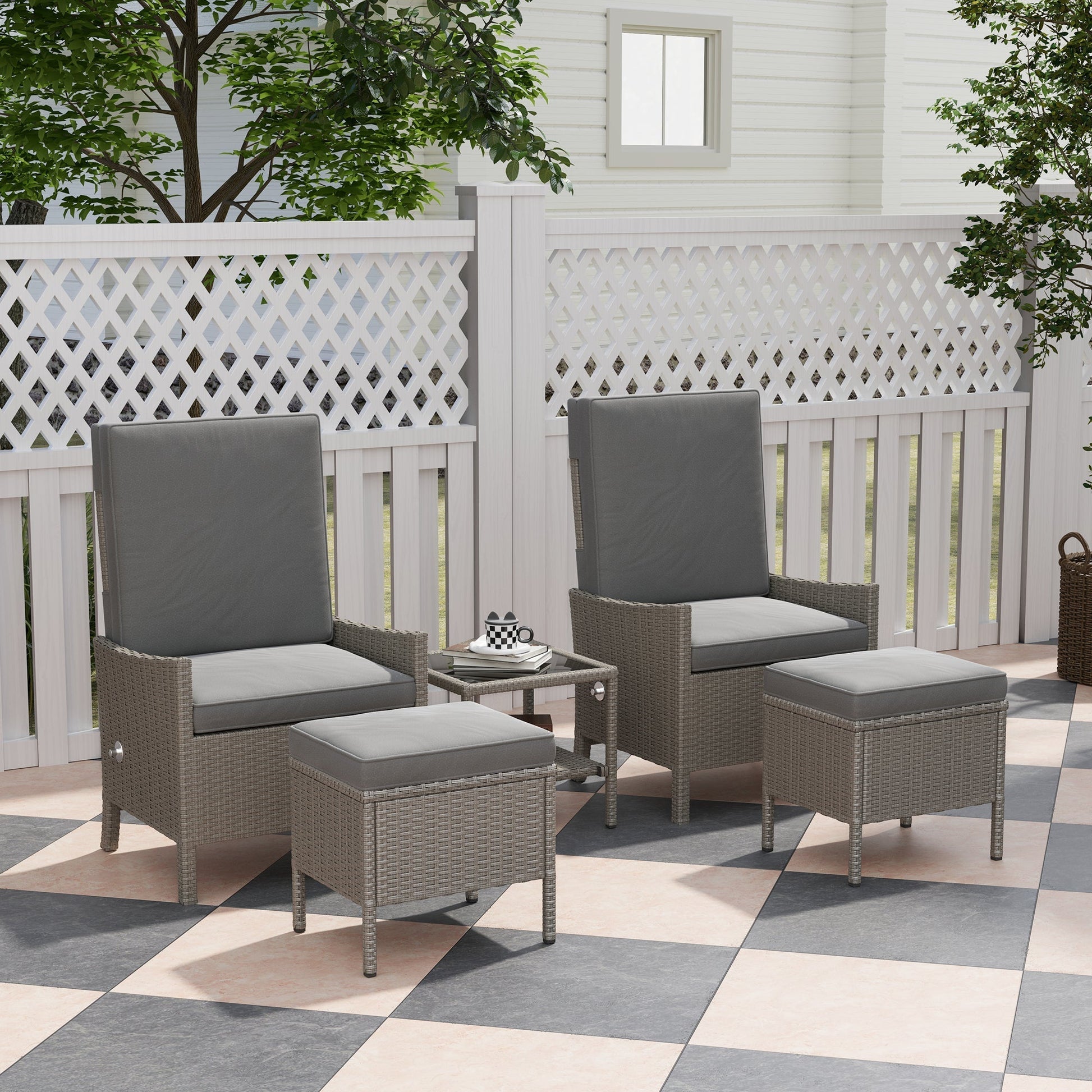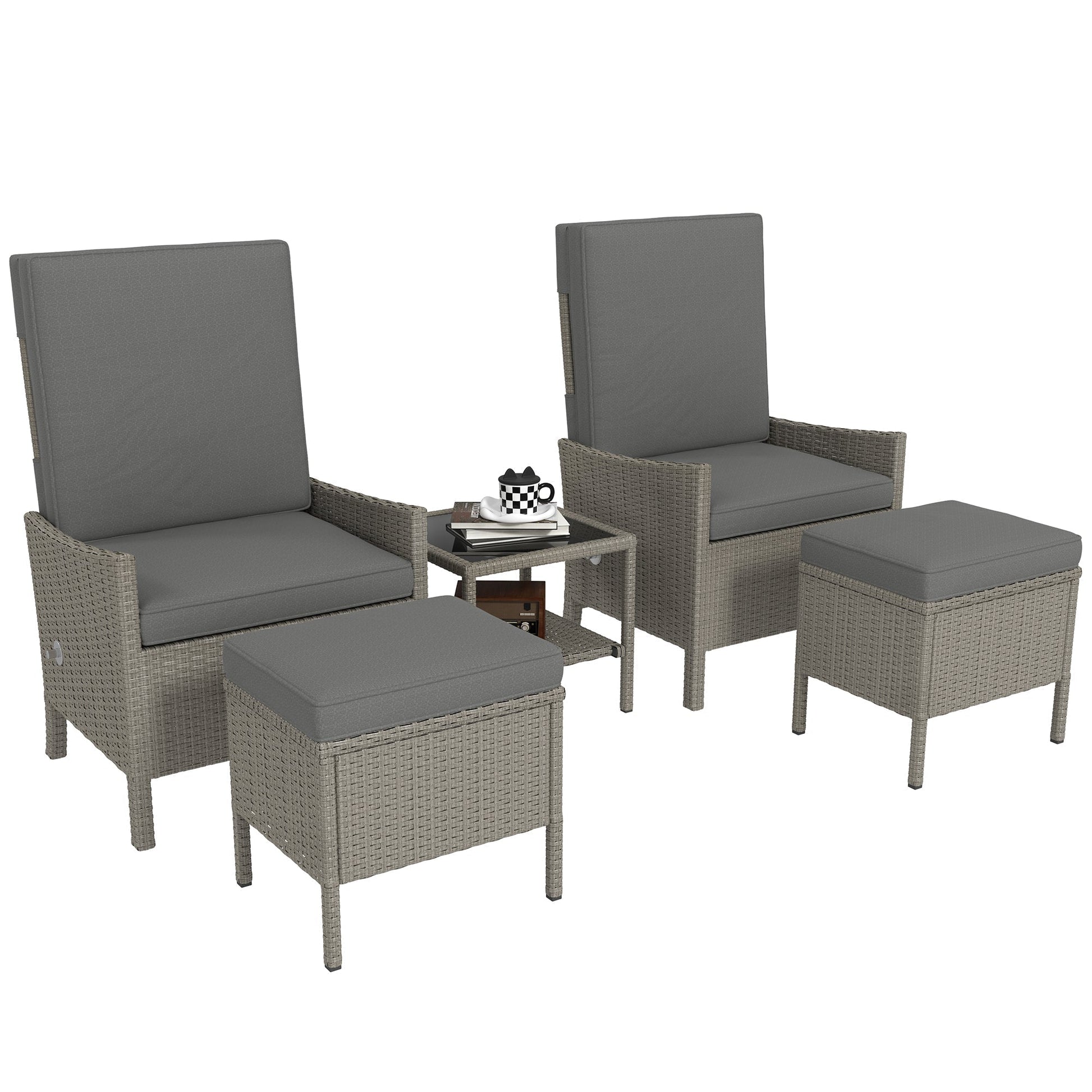 Outsunny 5 Piece Rattan Garden Furniture Set, Wicker Patio Sofa Set with 2 Armchairs, 2 Footstools, Glass Top Coffee Table with Shelf, Outdoor Furniture with Adjustable Backrests, Cushions, Dark Grey