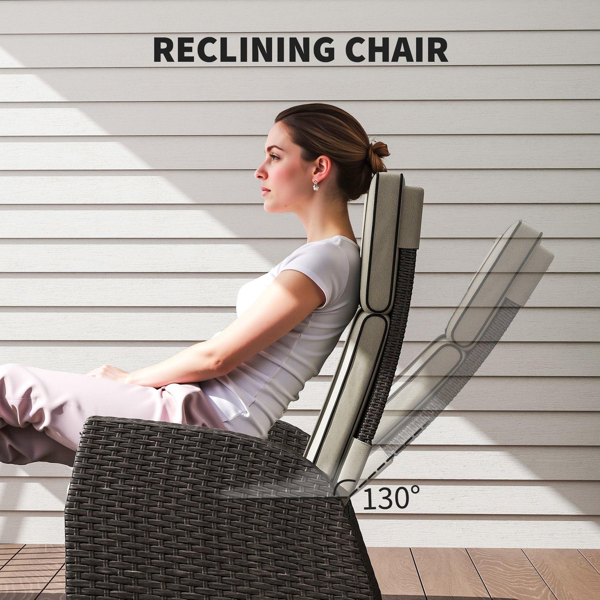 Rest and relax with company, with this Outsunny conservatory furniture. Five pieces - two reclining chairs, two footstools and a matching coffee table so you can relax with company. The two chairs have 130 reclining backs, with padded cushions for comfort. Each piece has a powder coated steel frame for a strong core, wrapped in plastic wicker for extra durability and style. Complete with adjustable feet for balance.