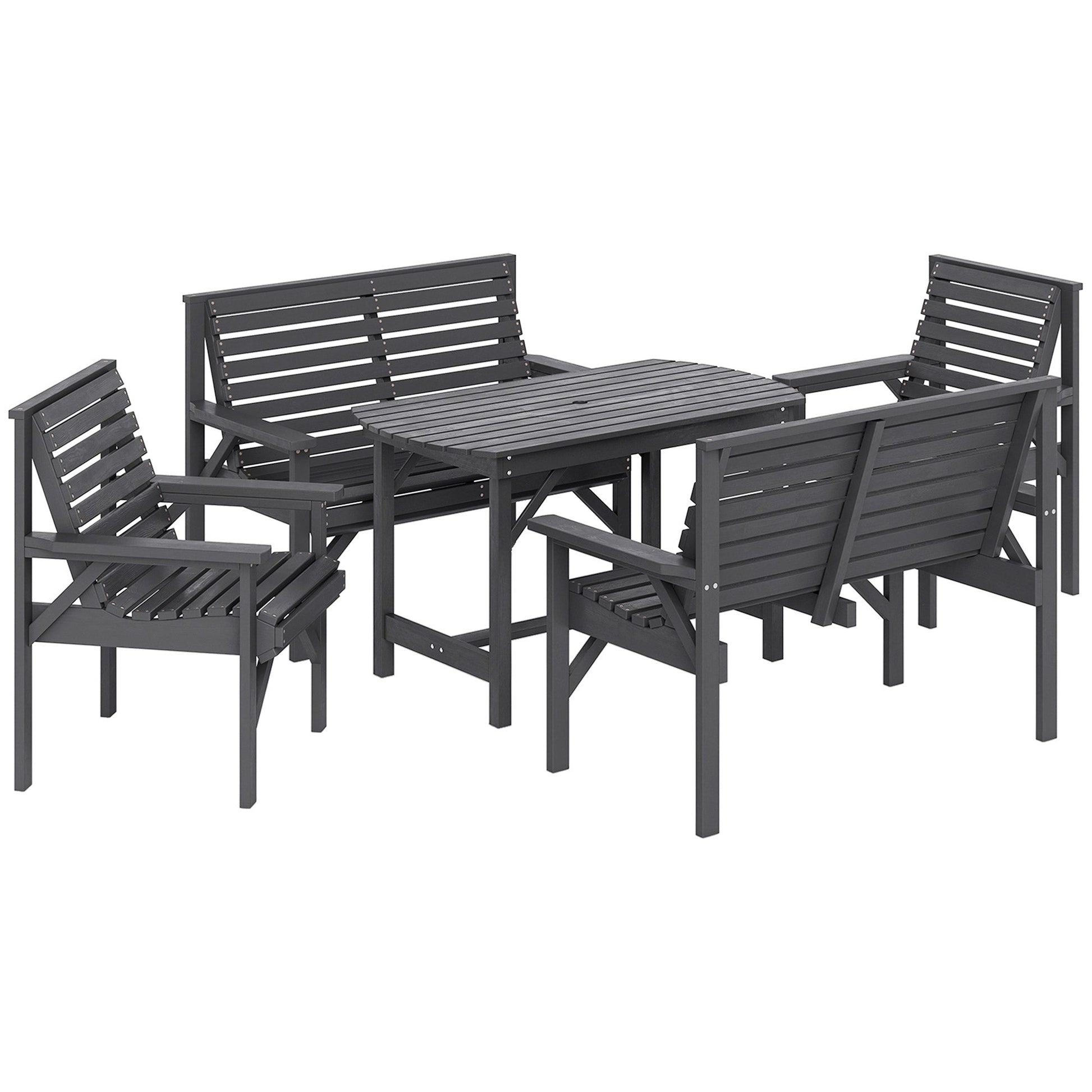 Outsunny 5 Piece Wooden Garden Dining Set for 6, Outdoor Conversation Set with 2 Armchairs, 2 Loveseats and Dining Table with Umbrella Hole for Patio, Balcony, Grey