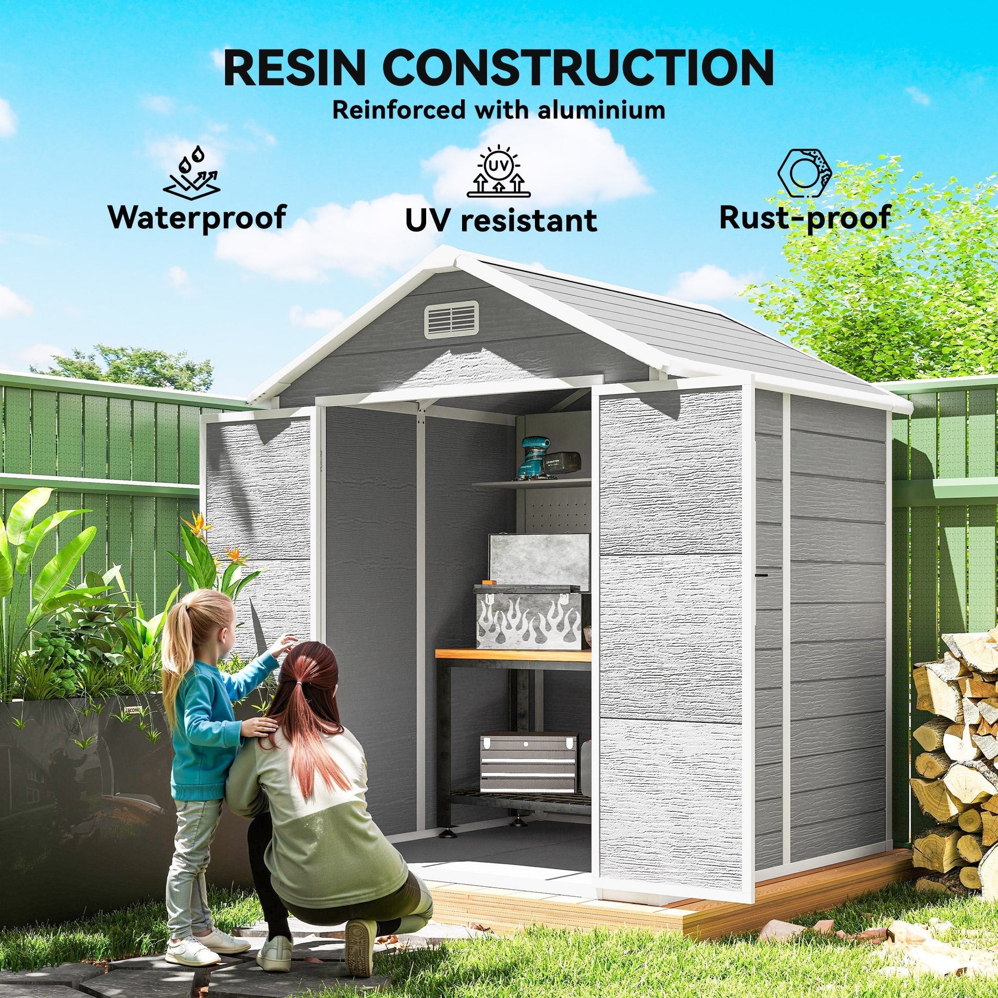 Discover the Outsunny plastic garden shed, where style meets functionality. Spanning 182 x 151 x 219cm, this outdoor shed provides a spacious 162 x 131cm interior, clad in 12mm thick, wood-effect polypropylene resin that's not only waterproof and UV resistant but incredibly chic. With a clear window for natural light and dual vents, it ensures your belongings stay dry and fresh.