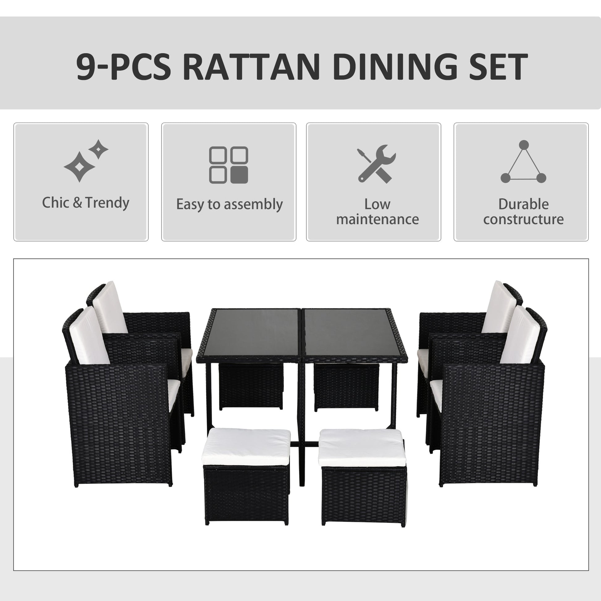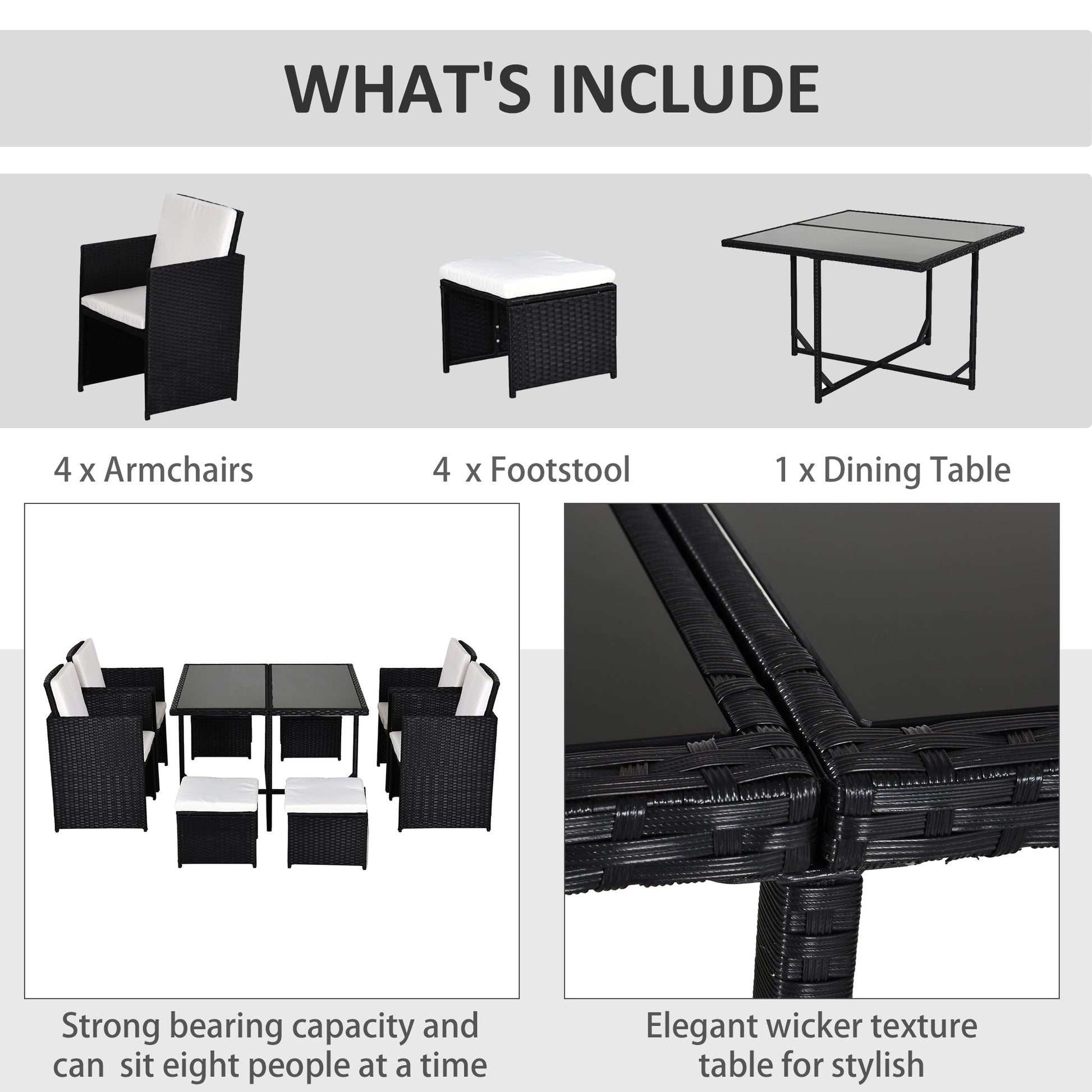 Outsunny 8 Seater Rattan Cube Garden Furniture Set, Rattan Dining Set with Cushions, Outdoor Dining Table and Chairs with 4 Armchairs, 4 Stools, Square Glass Top Table, Black
