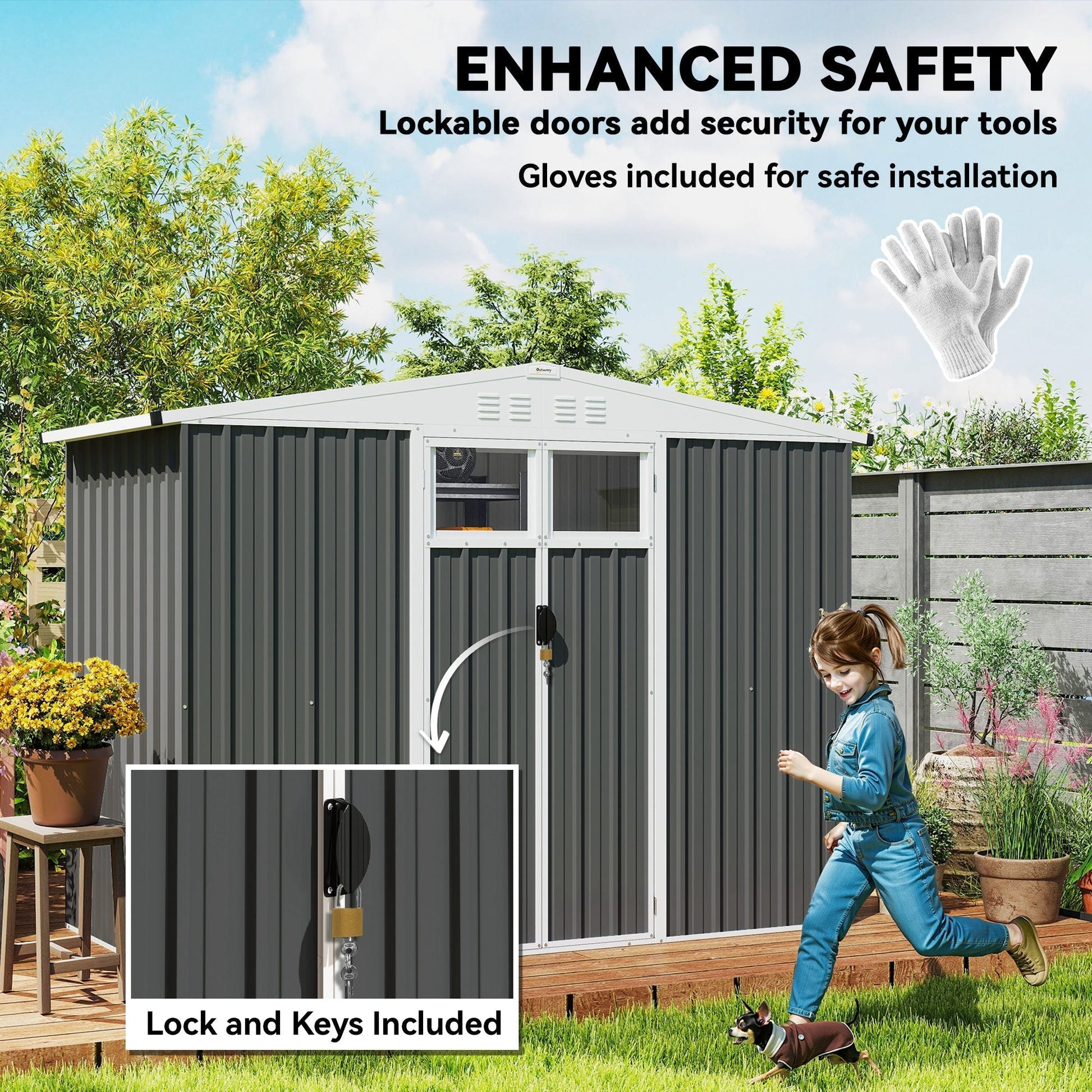 Discover the charm of tidiness with the Outsunny metal garden shed. Spaciously designed to house everything from bikes to garden tools, this garden shed features double doors for easy access and secure storage. Enjoy natural light with two transparent windows and keep the air fresh with four well-placed vents. Made from anti-UV, rust-resistant galvanised steel, it's the stylish haven for all your outdoor essentials.