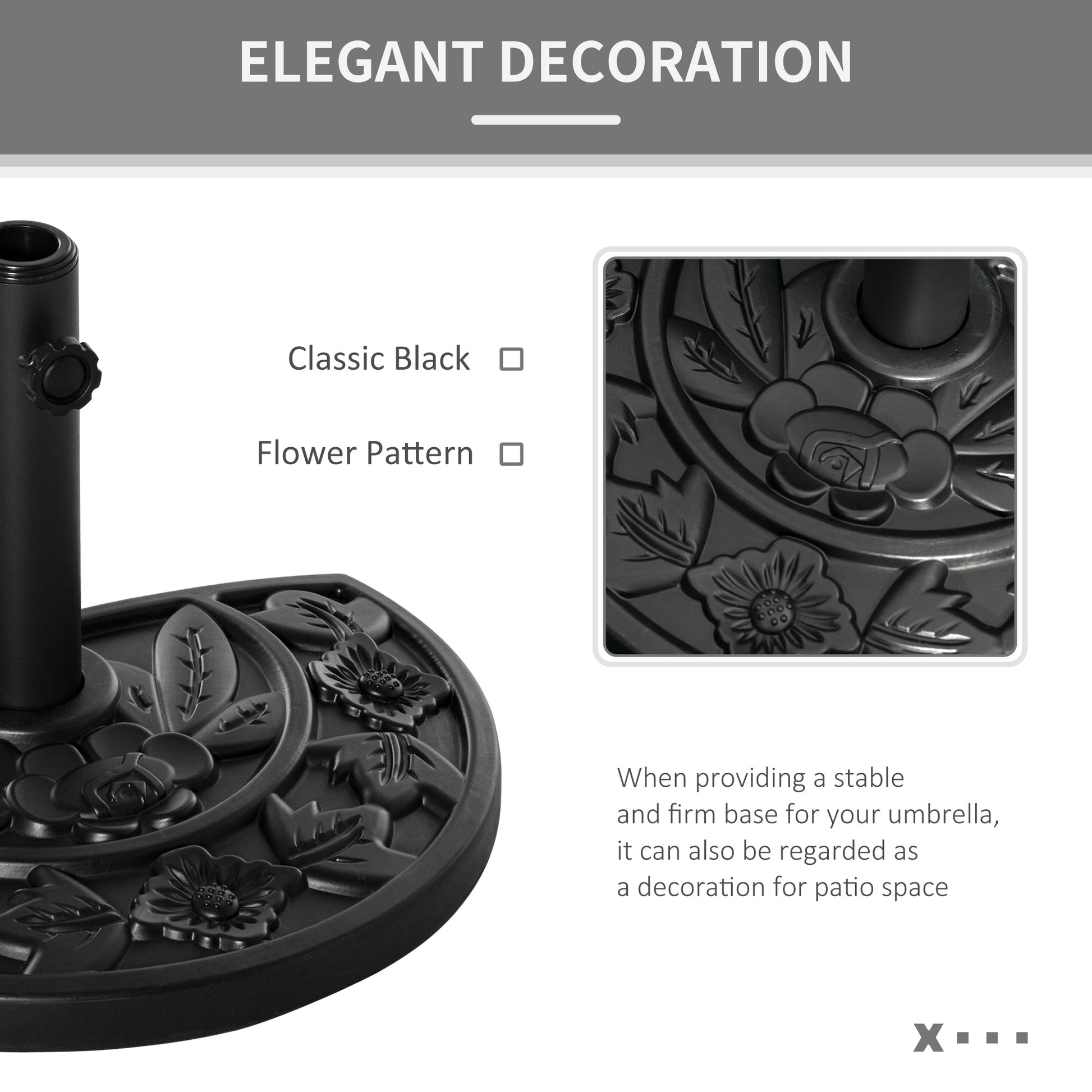 Incorporate elegance into your garden furniture with this half parasol umbrella base from Outsunny. Made from a blend of HDPE, cement and metal and weighing 9kg, it can withstand heavy rain and wind conditions, making it suitable for use all year round. In a versatile black hue, it features a top engraved with a delicate and beautiful flower design and it is finished with a tightening screw to hold the parasol pole securely in place all day long. It’s the perfect combination of beauty and functionality.