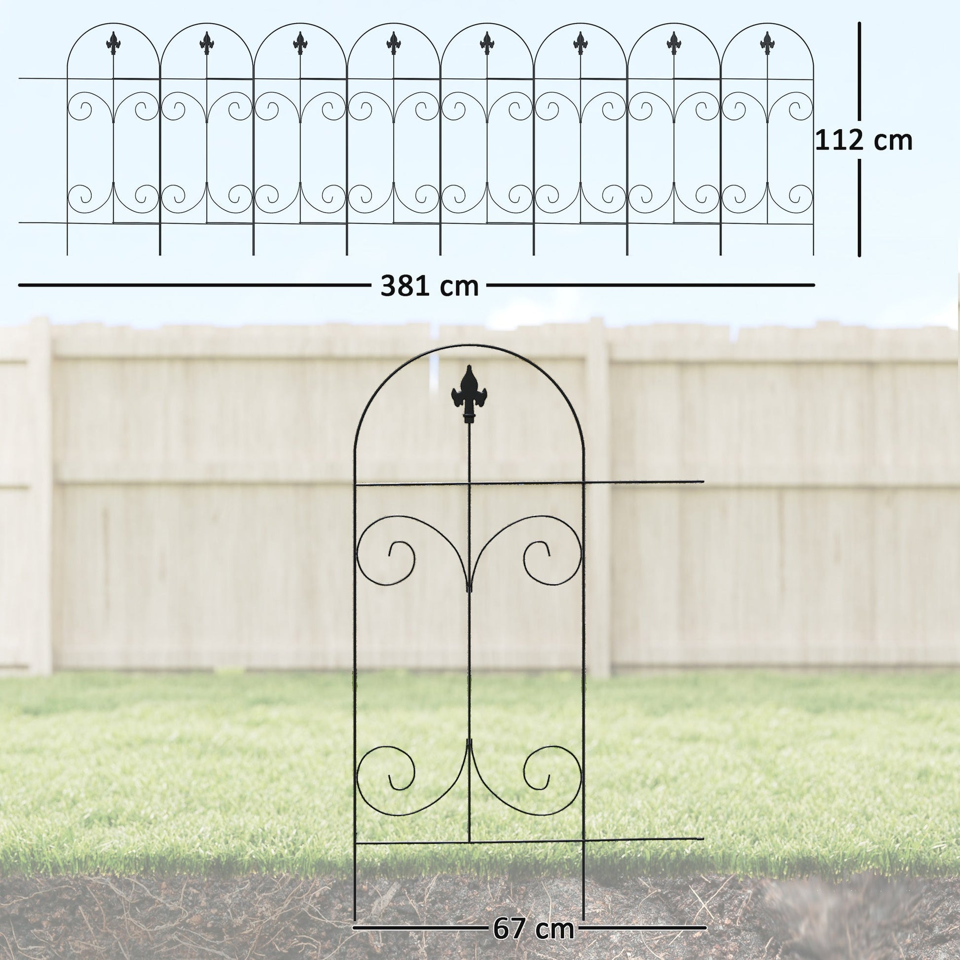 A beautiful and practical fence which can easily be shaped to suit you: this Outsunny piece is the perfect entrance to your home! 3.8m long, each panel can be flexed to a different position, making it great for obscure shaped areas. Made from metal for a strong structure, the powder coating offers extra protection and strength. The inner swirls and saxon spears on the top create a beautiful, almost traditional look.