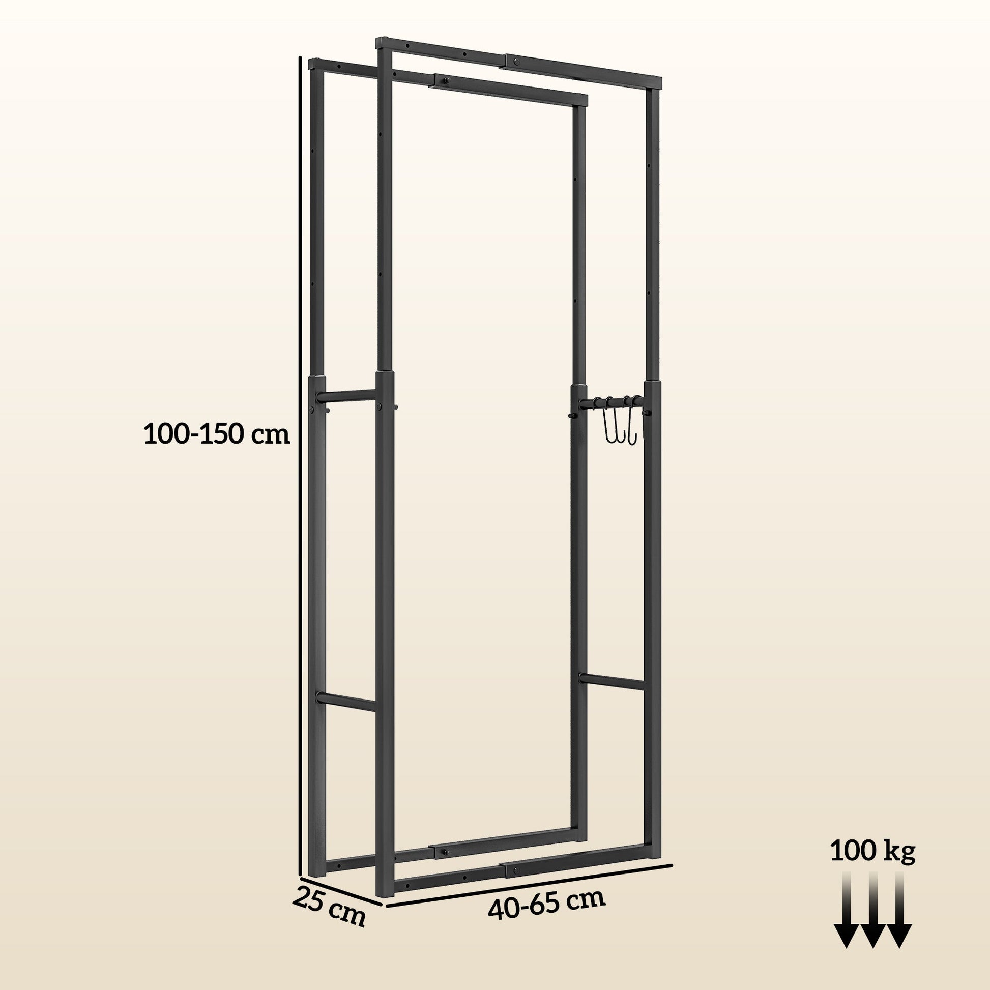 Keep firewood tidy and aerated with this Outsunny log holder. Expand this indoor and outdoor log storage rack 40-65cm in width and 100-150cm in height, catering for different loads of wood. The powder coated steel structure is strong and keeps in shape. The two racks also come with eight handy hooks to keep tools within reach.