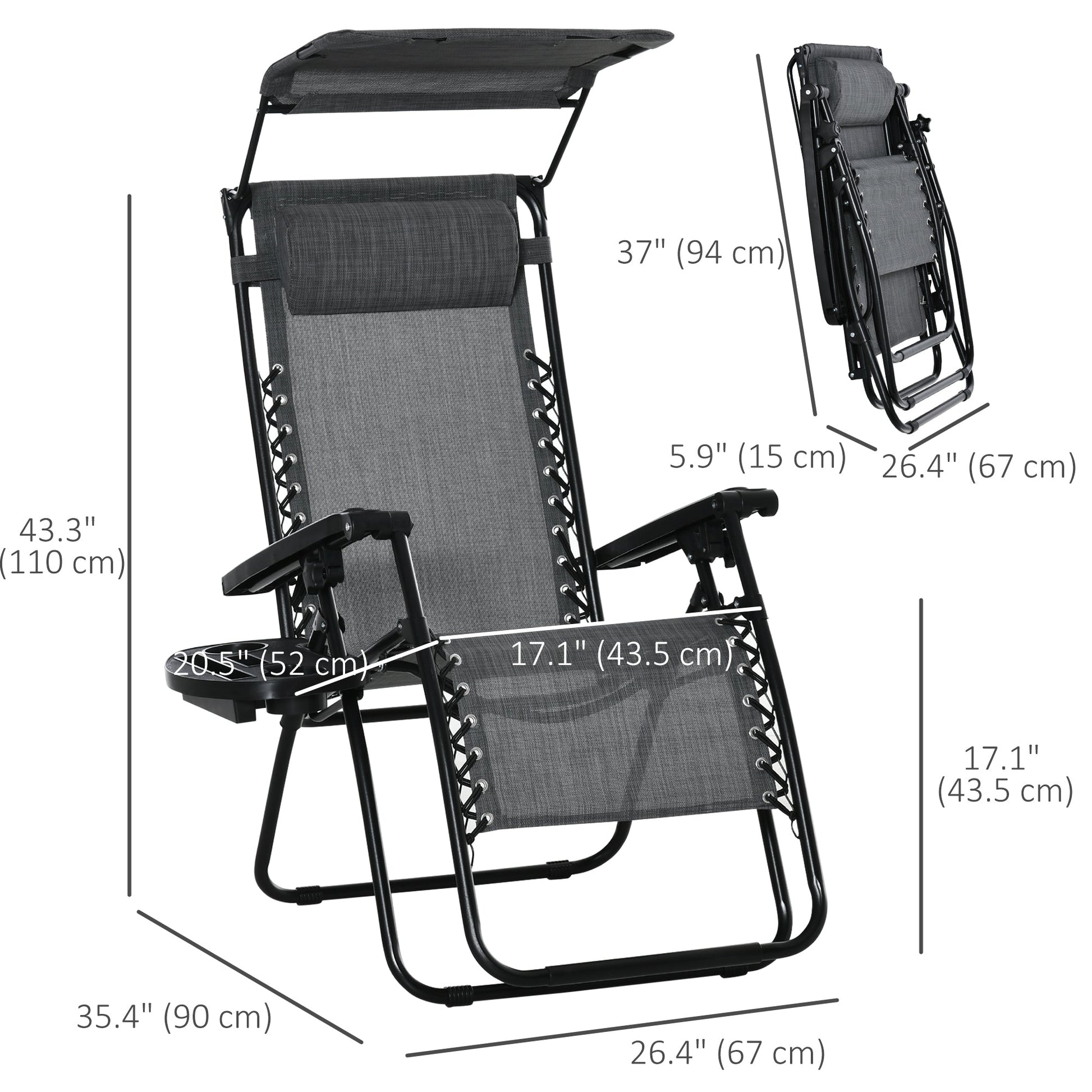 Outsunny Foldable Reclining Garden Chair with Headrest, Zero Gravity Deck Sun Lounger Seat Chair with Footrest, Armrest, Cup Holder & Canopy Shade, Light Grey