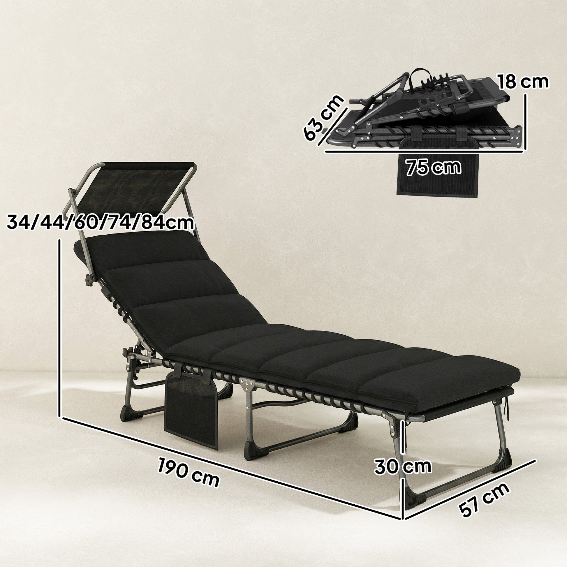 Sun lounger bed sessions can be a constant battle with the elementsâtoo hot on sticky chair, glare in your eyes and an uncomfortable neck. This struggle for simple relaxation often ends in frustration. Outsunny foldable sun lounger with cushion transforms your outdoors into a personal oasis. Find your preferred angle among five positions. Stay breathable and cool on the texteline seat or comfortable with soft cushion. Block the harsh sunlight with the adjustable canopy for blissful comfort.