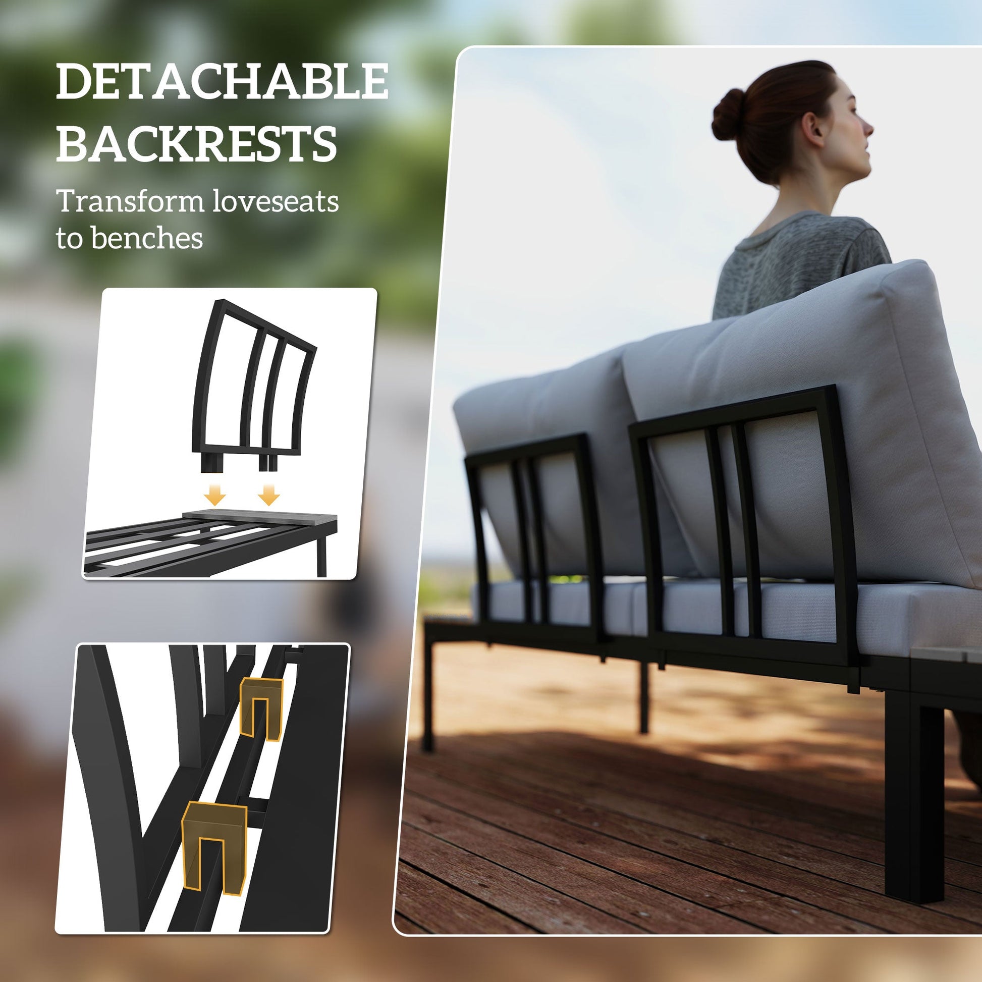 Transform your garden into a haven of relaxation with the corner garden furniture set from Outsunny. This versatile balcony furniture set includes two loveseats and two coffee tables, allowing you to configure them in L-shaped or straight, combination or separation for different outdoor gatherings. Enjoy comfort with soft, easy-clean cushions, strong support with metal frame and stylish convenience with the slatted tabletops. Great for any garden, balcony, or conservatory.