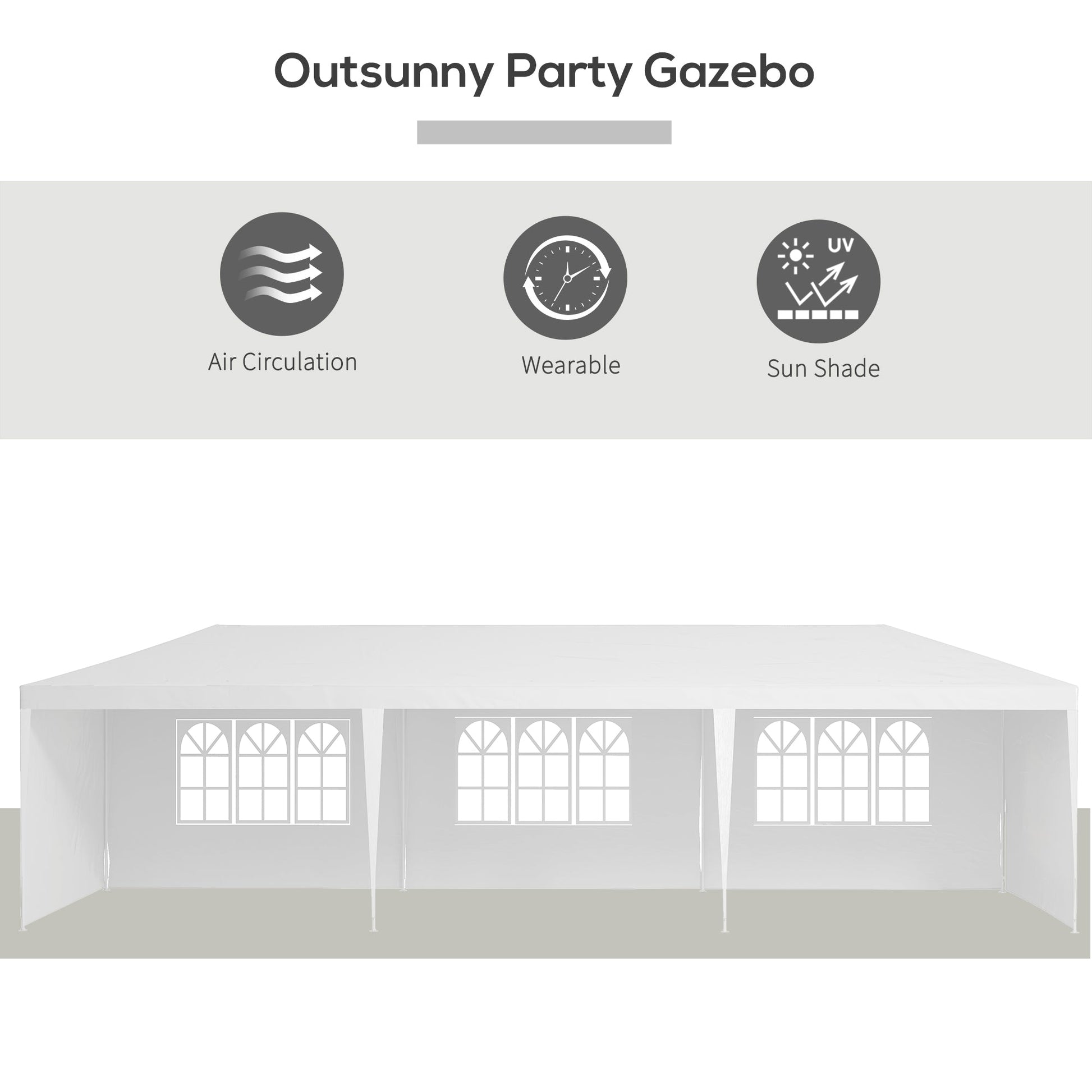 This Outsunny 3 x 9m size party gazebo is a great place to create a private party atmosphere. A powder coated steel frame means a strong core, fitted with a top canopy for shelter below. All the walls can be removed, so you can create and open or closed atmosphere. Eight guy ropes and 16x ground nails included to pin structure to the ground for extra stability. Whatever the event, this marquee gazebo with sides has got you covered.