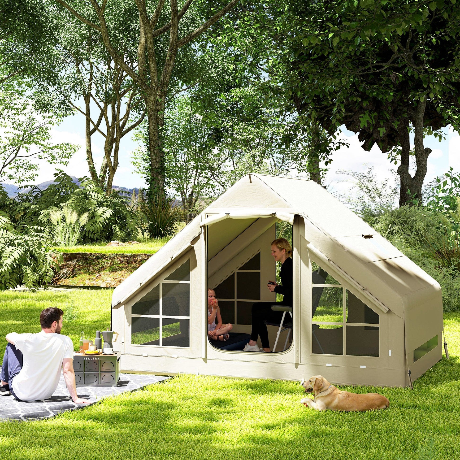 Outsunny Inflatable Camping Tent with Pump and Stove Jack Hole, Easy Setup 2-4 Person Blow Up Tent, Waterproof Luxury Inflatable Tent with Mesh Windows, Doors, Hook and Carry Bag, Beige