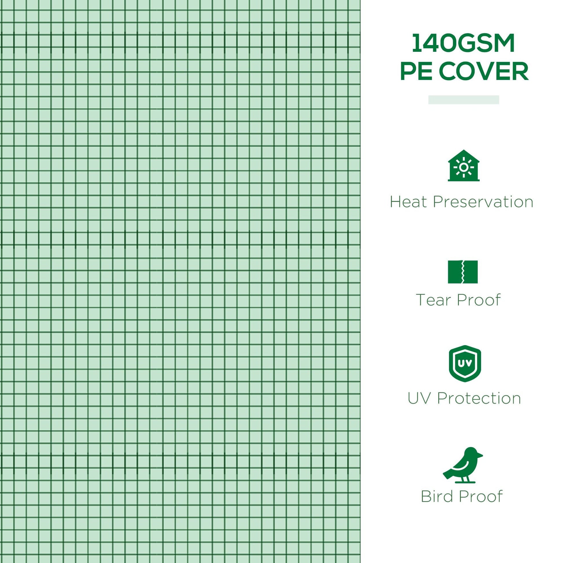 - Reinforced plastic cover, with 10cm extended edge to weigh down/dig into soil