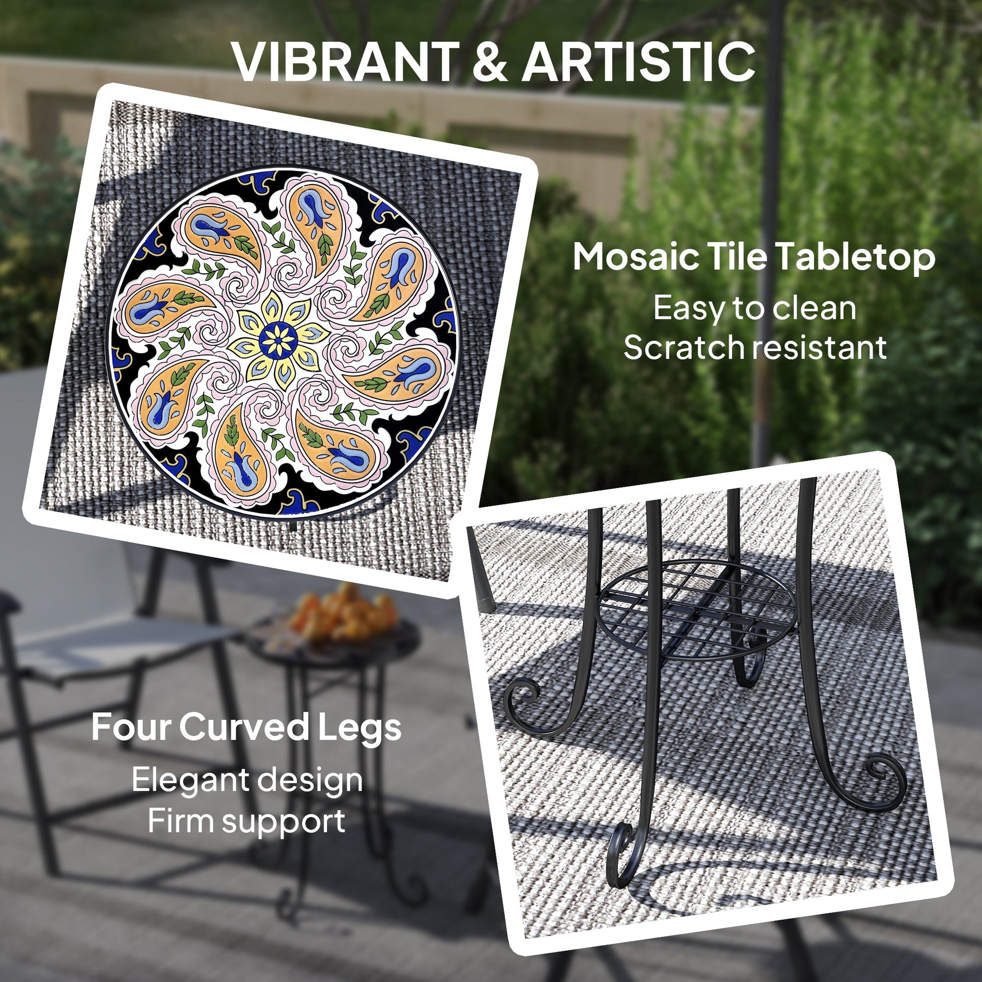 Add a splash of colour to your outdoor space with the Outsunny round garden table. This charming and striking patio table features a vibrant mosaic top and gracefully curved legs. With electrophoretic metal frames, this outdoor side table is strong to resistant water, weather and rust, complete with four legs for plenty of balance. It's not only a fetching small side table or bistro table but also includes a handy lower shelf for displaying plants or decorations.