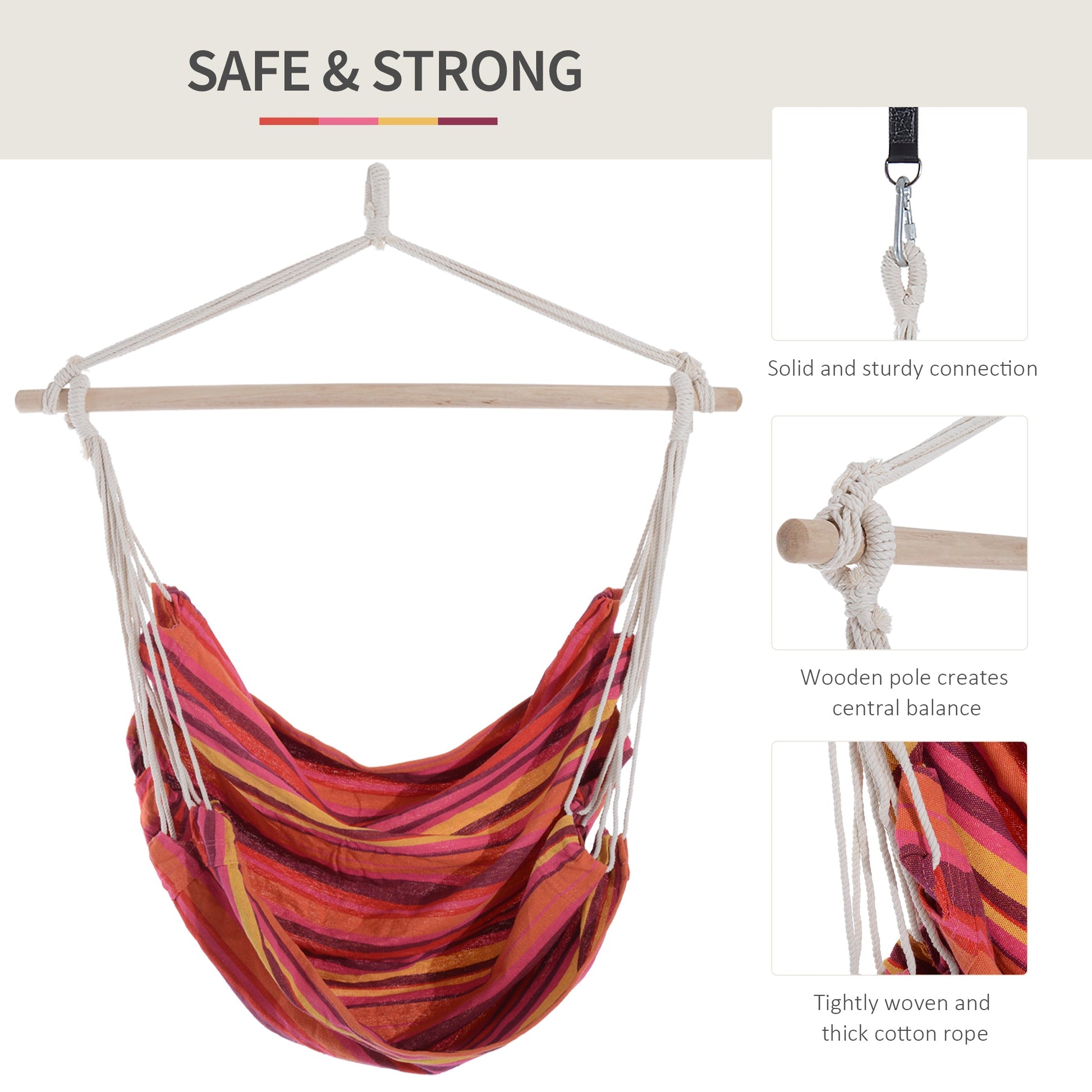Outsunny Outdoor Hanging Rope Chair with Cotton Rope, Garden Hammock Chair with Wooden Support Bar Cotton Cloth, Portable Garden Chair for Patio & Tree, Red