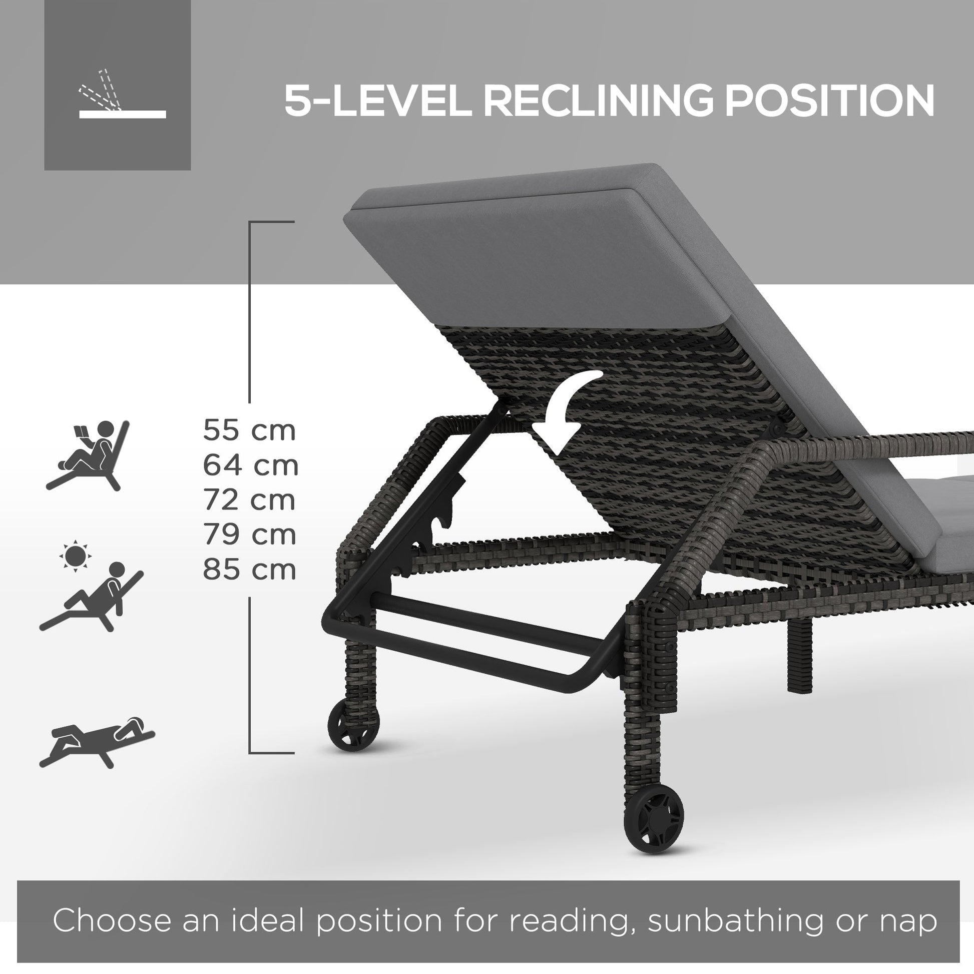This Outsunny sun lounger set is great for all-day relaxing. With a longline padded cushion and five-position back, this is a comfortable piece that can be customised to your choice. A metal frame for a strong core, wrapped in plastic wicker - protecting the metal whilst creating a stylish garden look. Complete with wheels to move around easily.