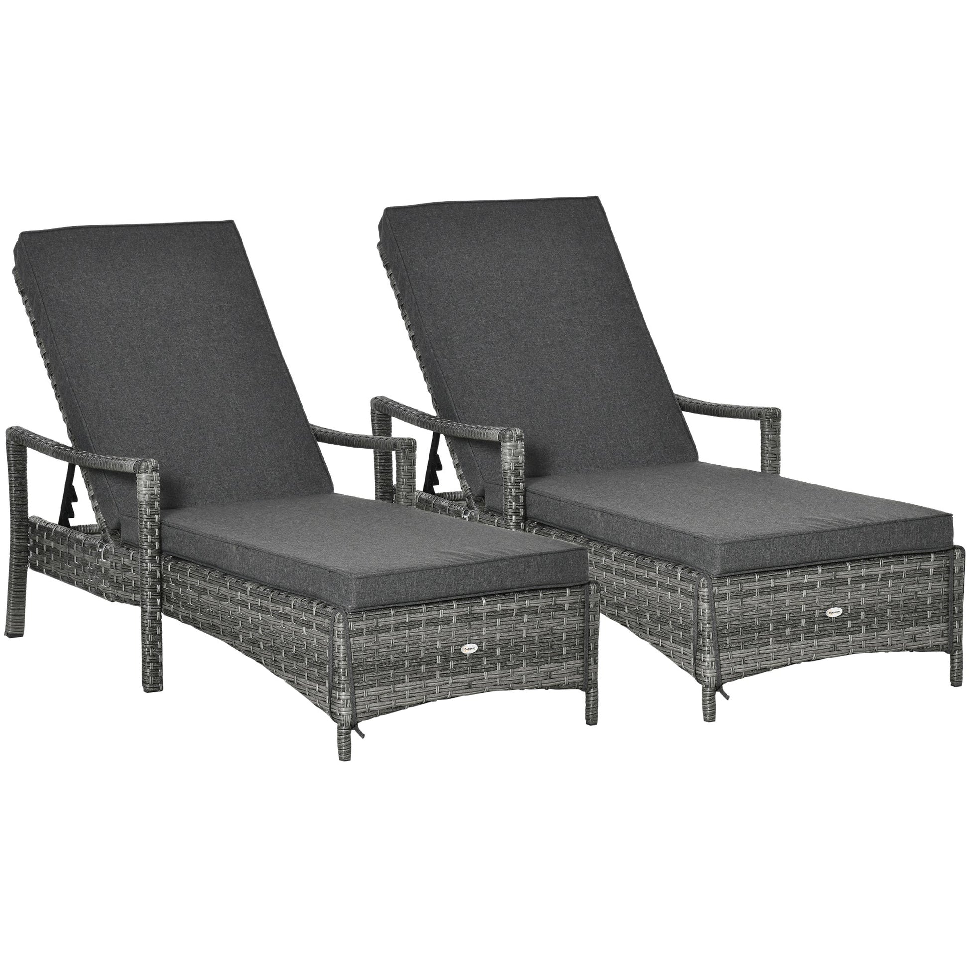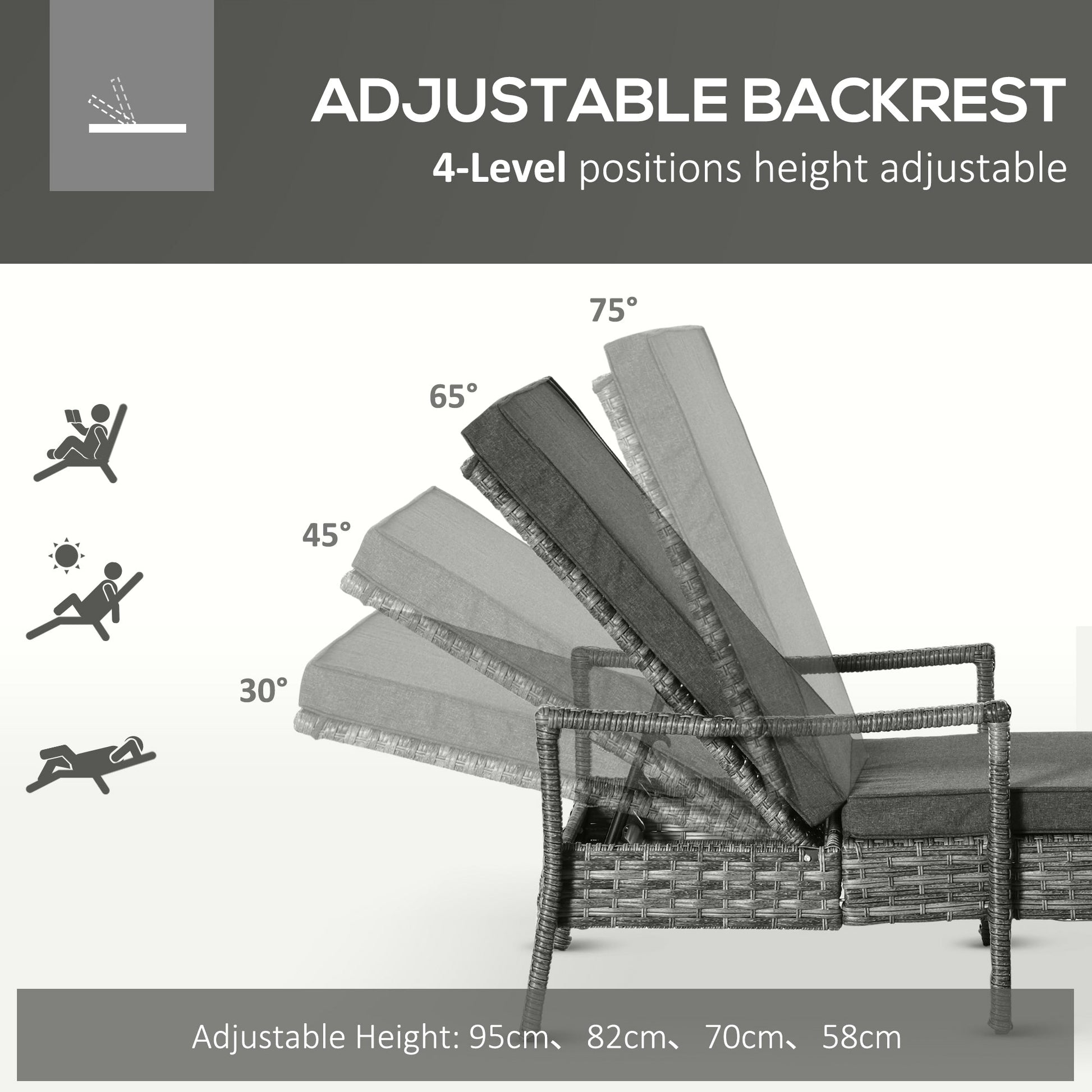 Outsunny PE Rattan Sun Loungers set of 2 with Cushion, Outdoor 2 Pieces Garden Sunbed Furniture with 4-Level Recliner Backrest, and Armrest, Grey