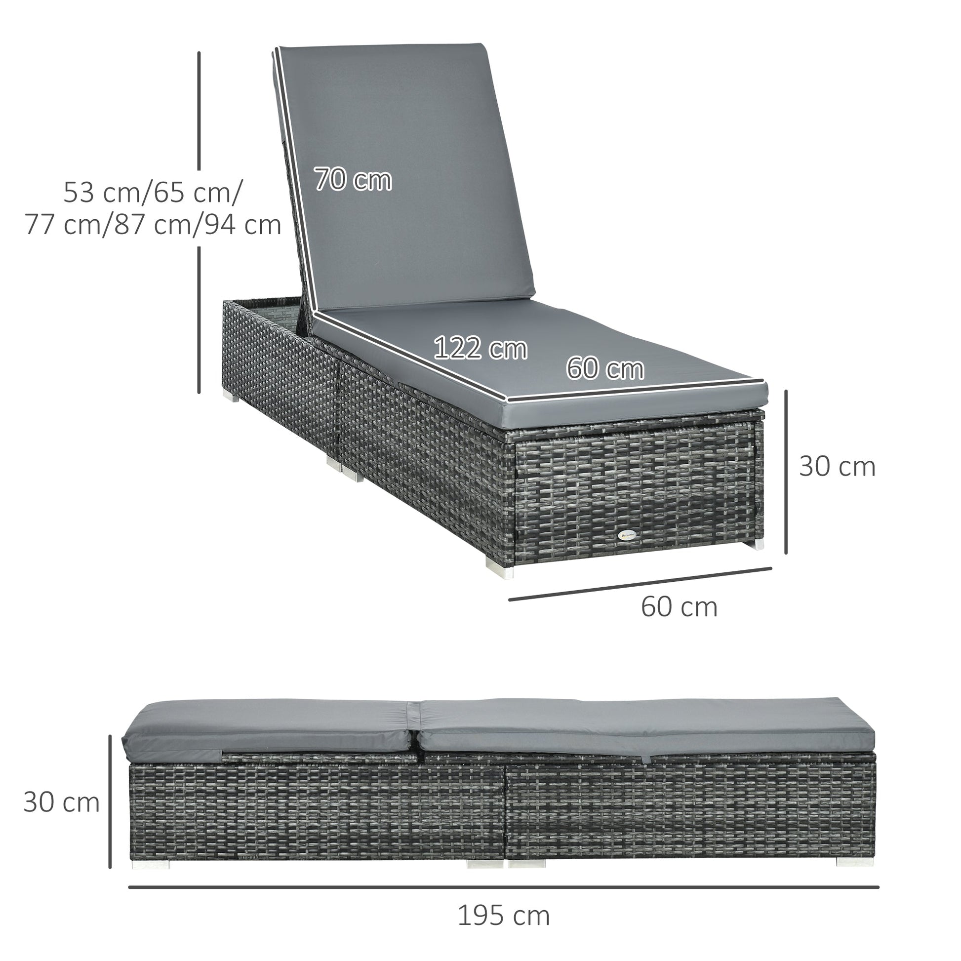 Outsunny PE Rattan Sun Loungers set of 2 with Cushion, Outdoor 2 Pieces Garden Sunbed Furniture with 5-Level Recliner Backrest, Reclining Patio Wicker Bed Chair, Grey