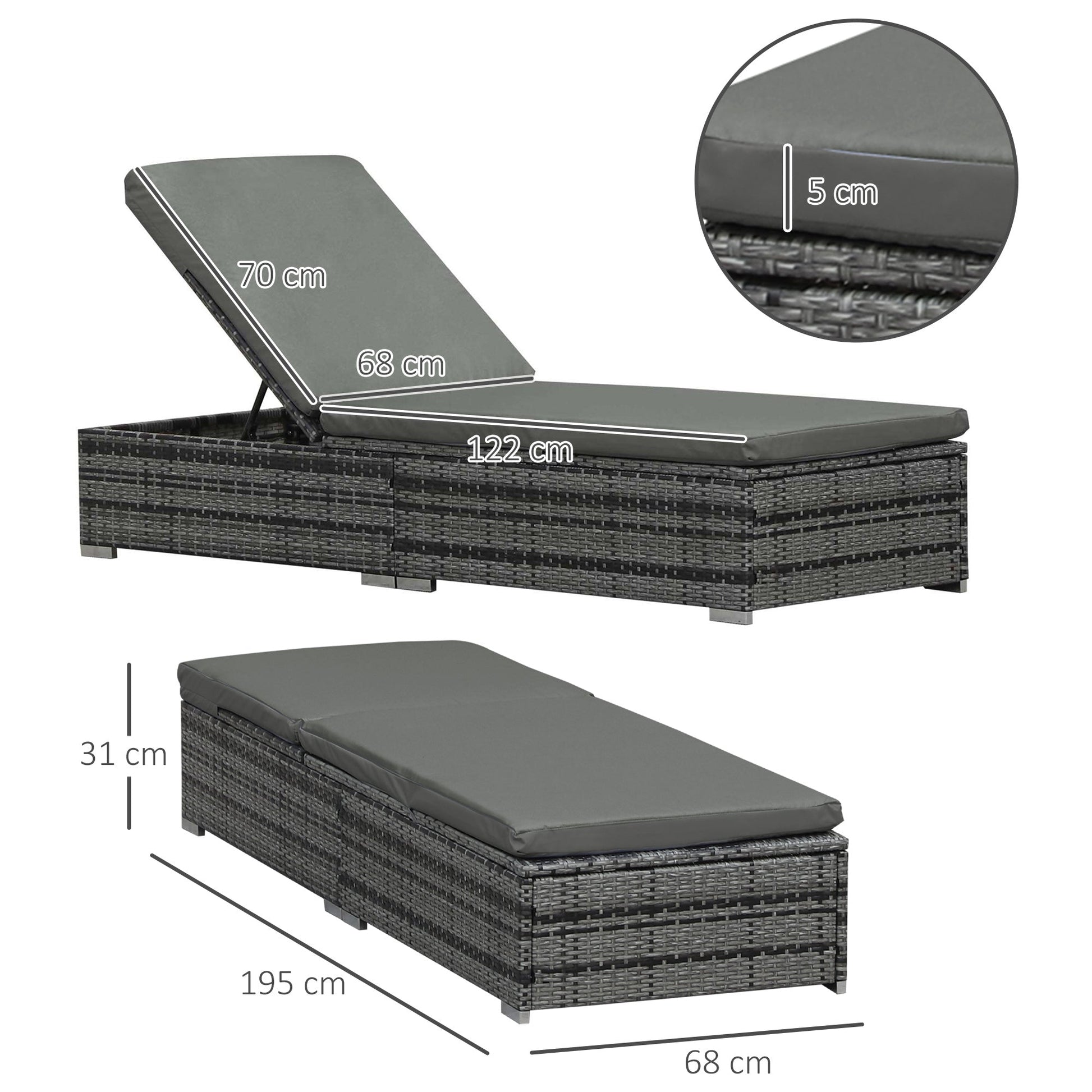 Outsunny PE Rattan Sun Loungers with Cushion, Outdoor Garden Sunbed Furniture with 5-Level Recliner Backrest, and Armrest, Set of 2, Grey