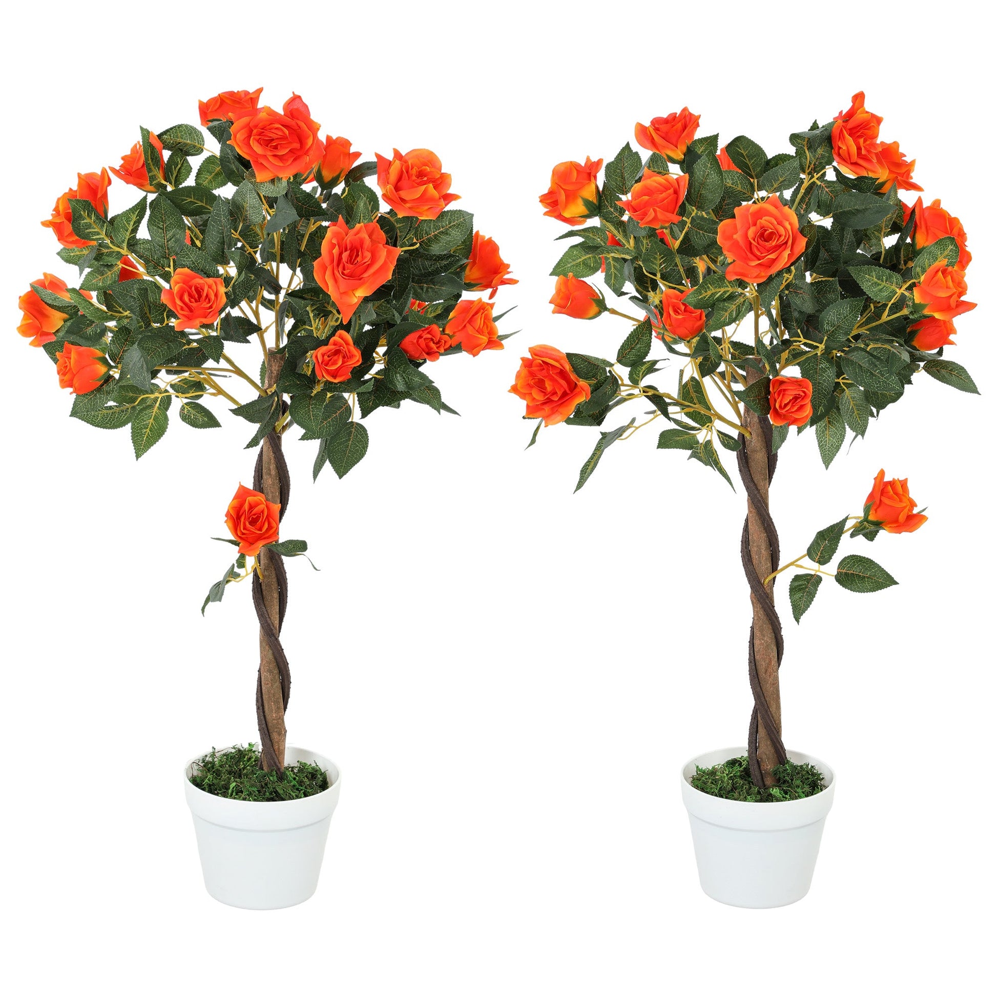 Outsunny Set of 2 Artificial Plants White Rose Floral in Pot, Fake Plants for Home Indoor Decor, 90cm, Orange