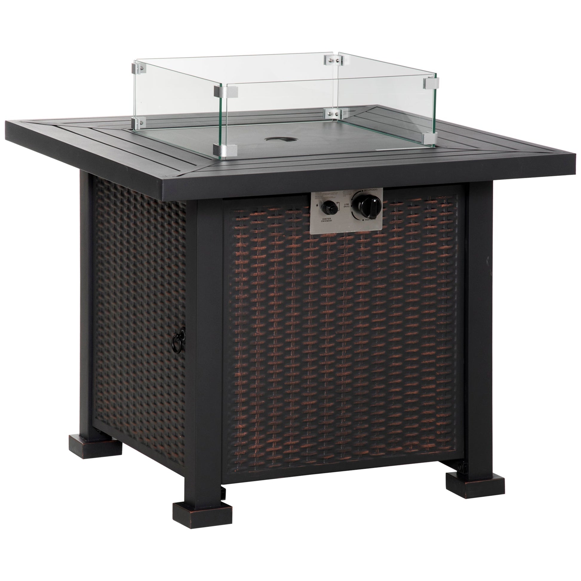 Outsunny Square Propane Gas Fire Pit Table, 50000 BTU Rattan Smokeless Firepit Patio Heater with Glass Screen, Glass Beads and Lid, 81cm x 81cm x 64cm, Black