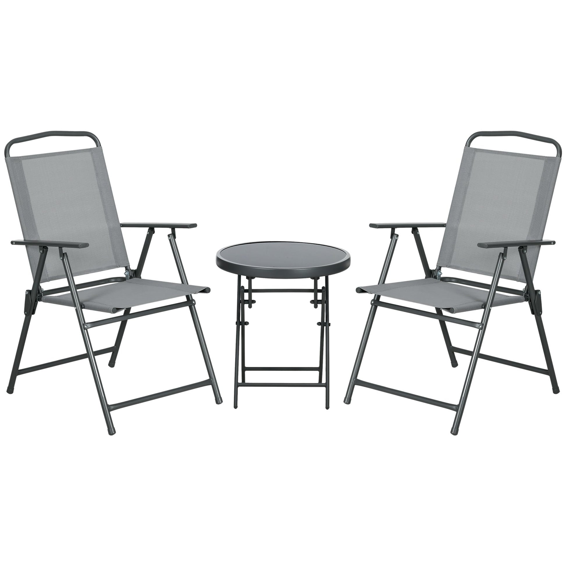This Outsunny set comes with a round table and two matching chairs - enjoy time outdoors with company, practically anywhere. Powder coated metal frames mean strong cores to support you. Each piece is foldable - easy to carry and store away. The table is fitted with a tempered glass top - a sleek and safe finishing touch.