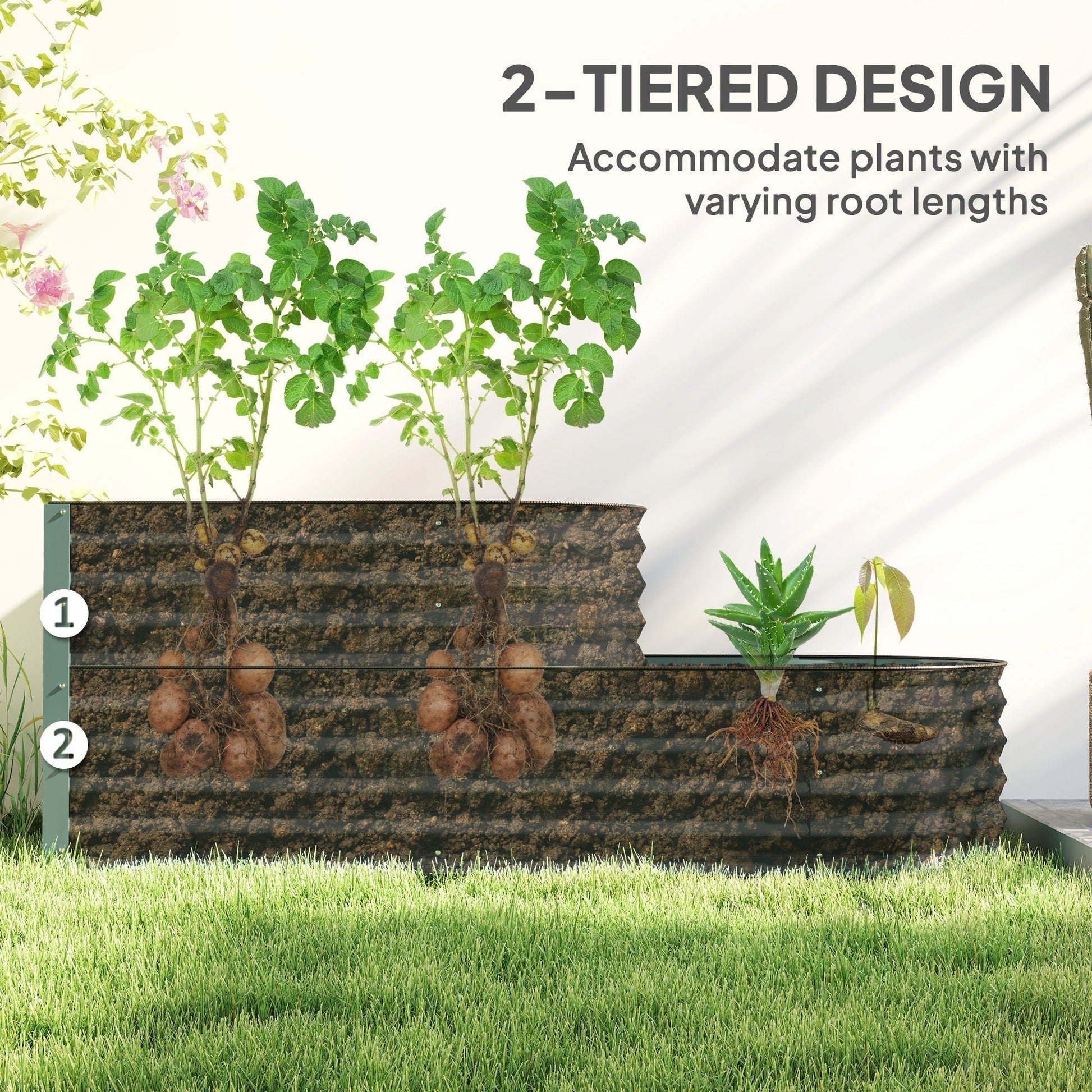 A place for plants to grow to their fullest, in their natural environment, with this Outsunny planter. The galvanised steel shell creates a safe fence, whilst the open bottom means direct contact with soil for excellent growth; plus it means no water build-up. Comes in a two-tier design: plenty of space for two different plants as you choose.